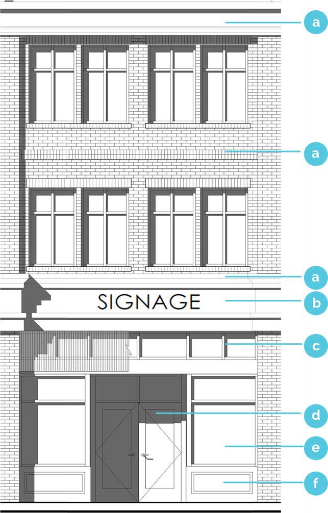 Building Articulation on Street Facing Facades. The ground story of non-residential facades fronting Main Street may contain the following elements as illustrated in Image 6.2.1.C.3 below.