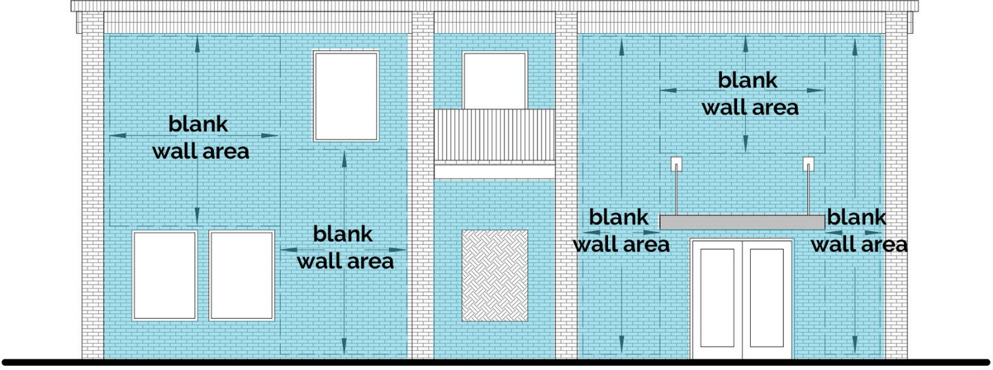 Blank wall area can be broken up or interrupted to meet these provisions with any one of the following interventions: