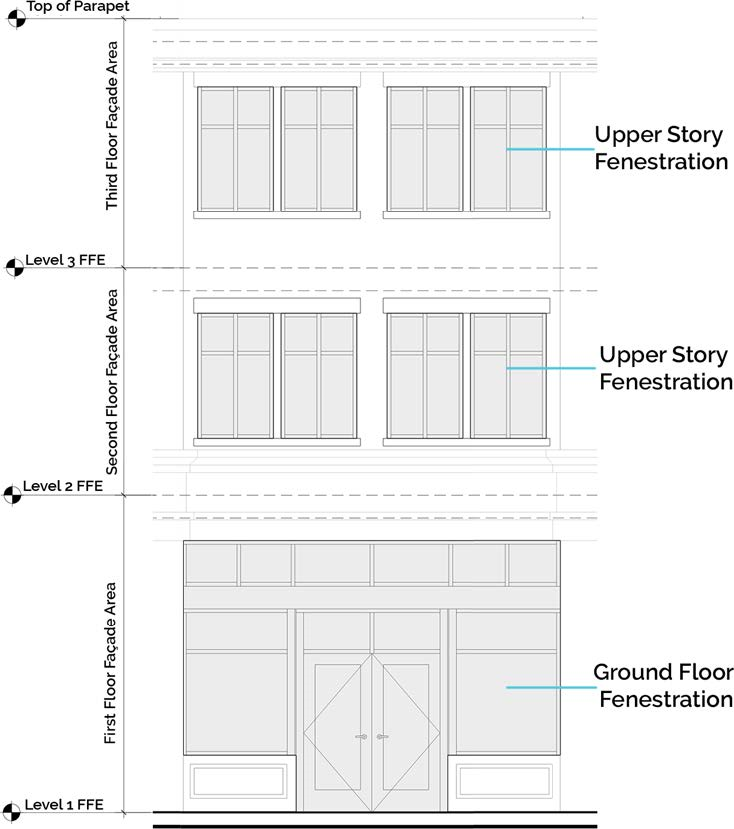 A minimum of 50 percent of commercial facades and 25 percent of residential facades shall be covered with fenestration. Fenestration percentage is calculated based on facade area and by floor. The facade area used to determine fenestration is measured from the top of the finished door to the top of the finished floor above or top of a roof parapet.