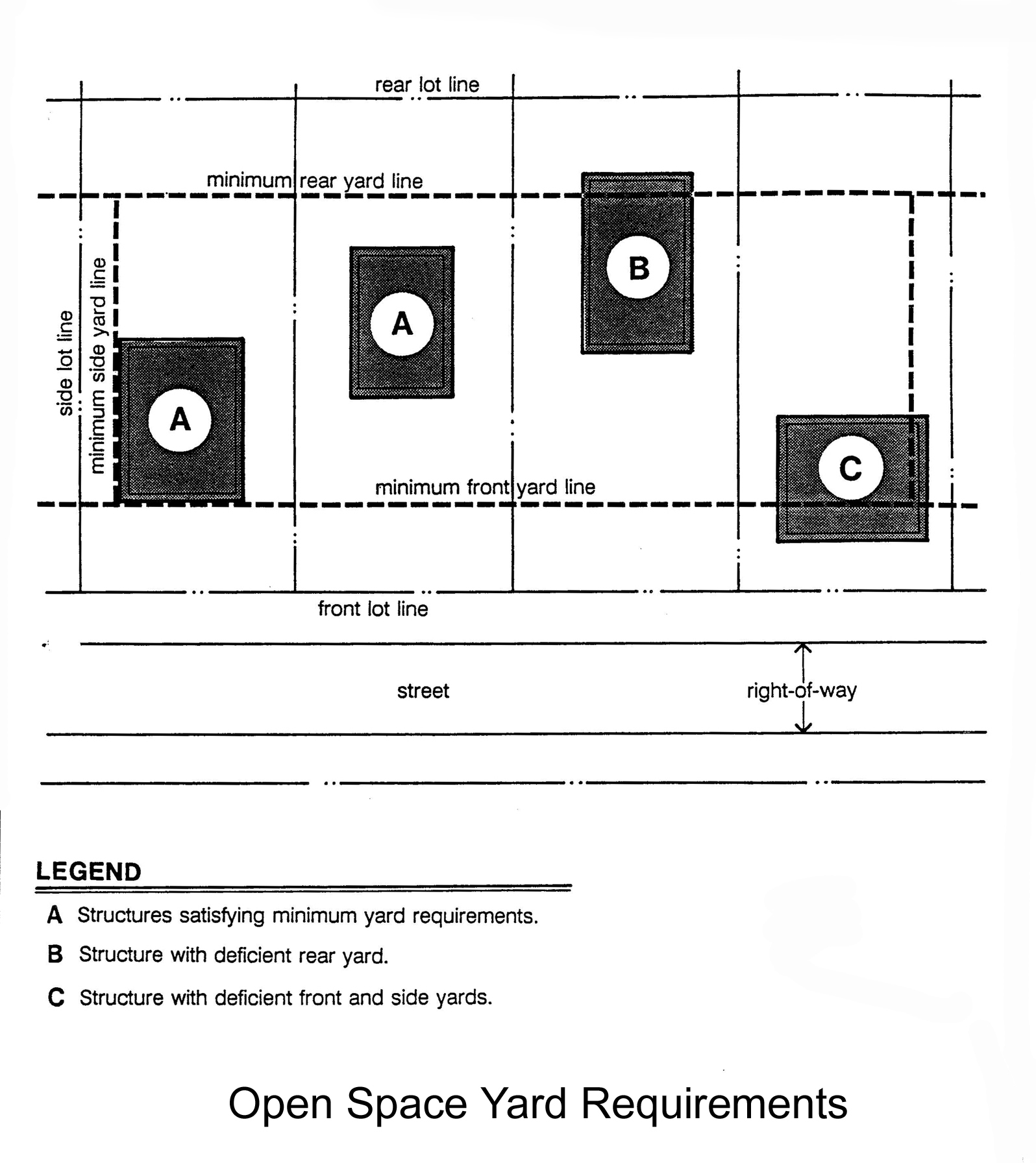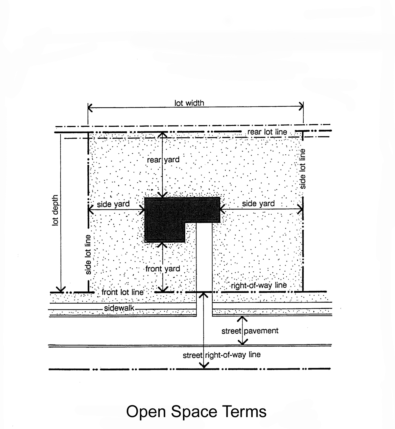 Rear (back) yard: An open space extending the full width of the lot, the depth of which is the minimum horizontal distance between the rear lot line or established zoning district line and nearest line of the principal buildings.