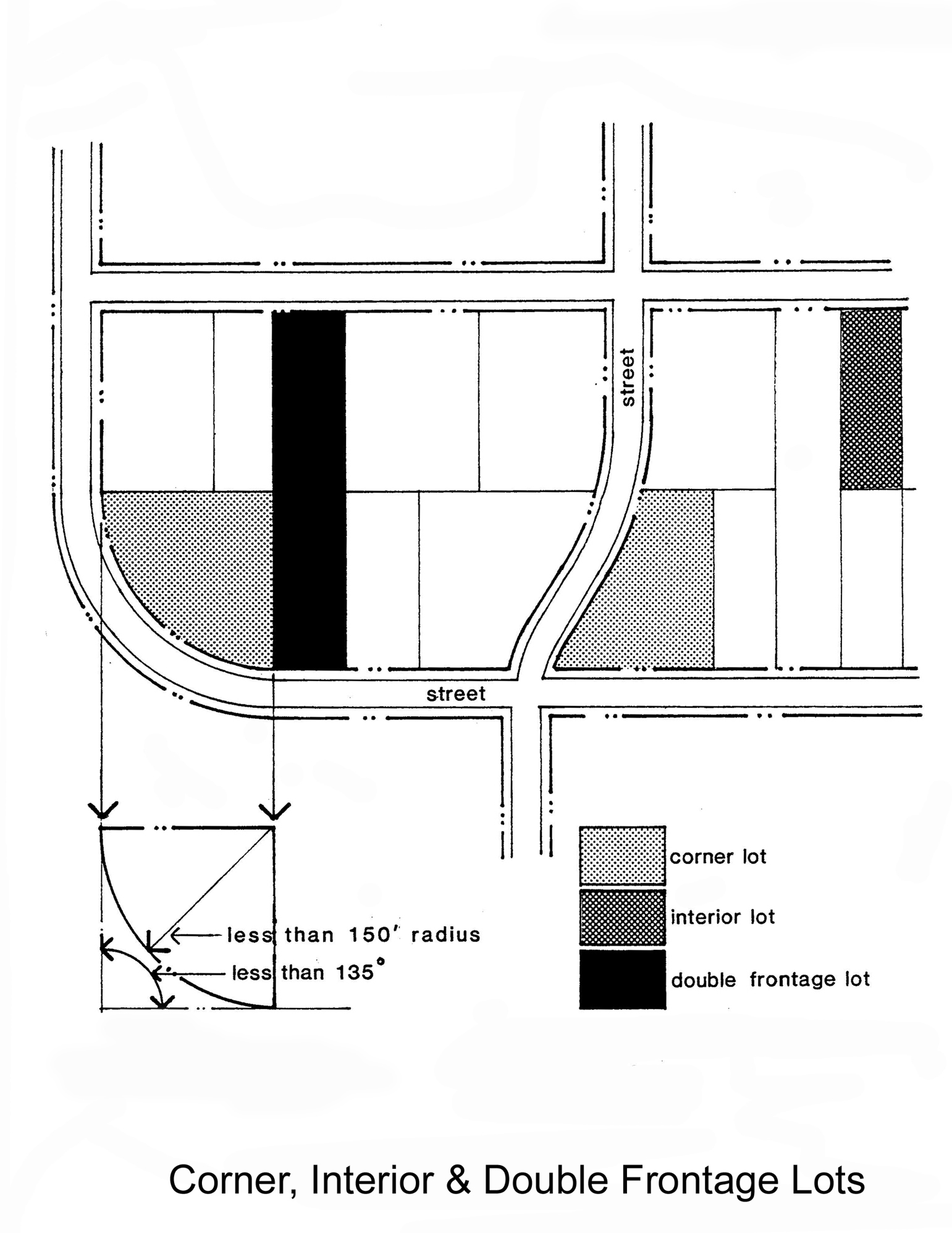 CORNER, INTERIOR AND DOUBLE FRONTAGE LOTS (see illustration following definitions).
