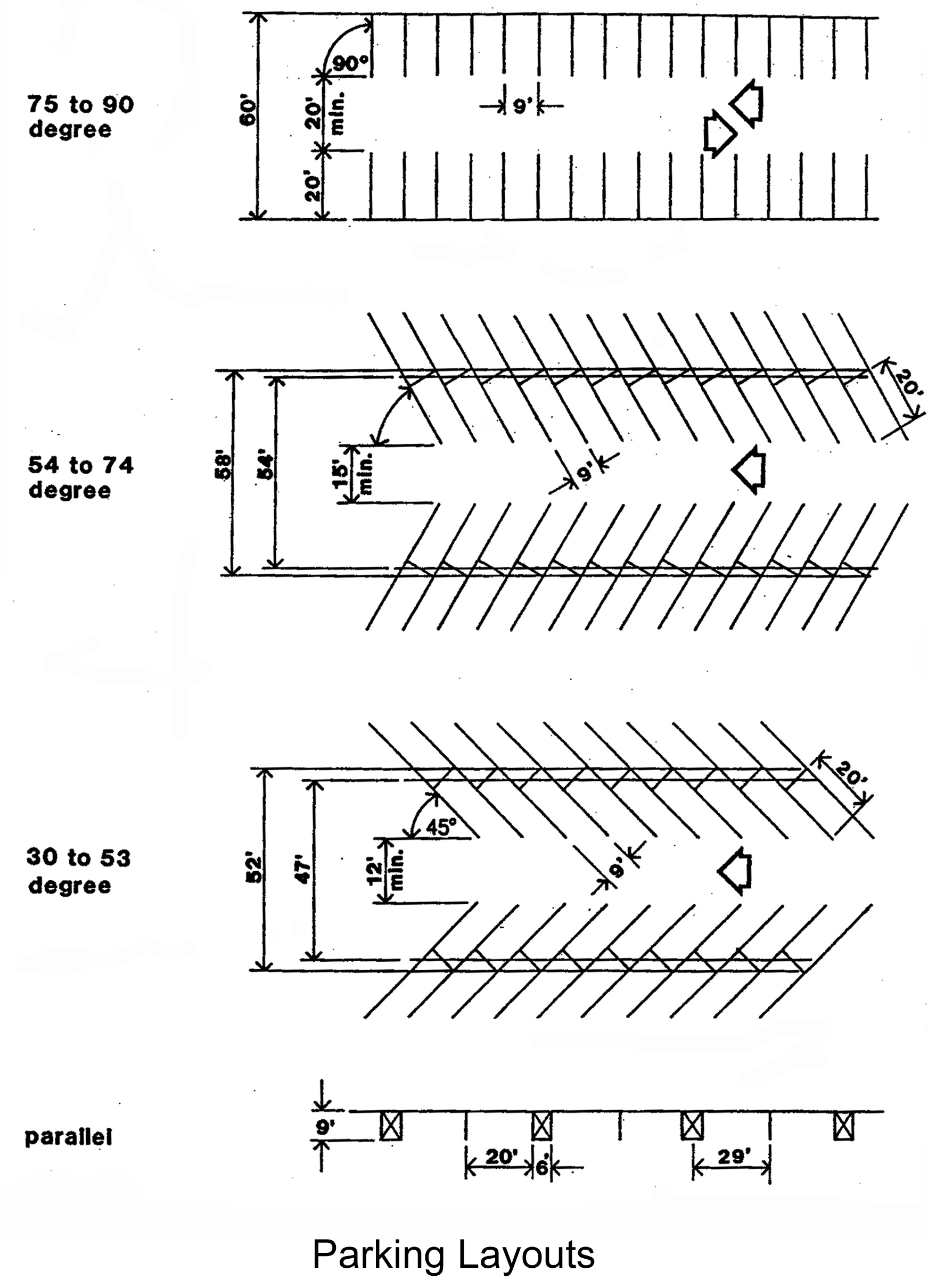Parking space: A rectangular area of not less than nine (9) feet wide and twenty (20) feet long exclusive of drives, aisles or entrances giving access thereto, which shall be fully accessible for the storage or parking of each automobile or motor vehicle.
