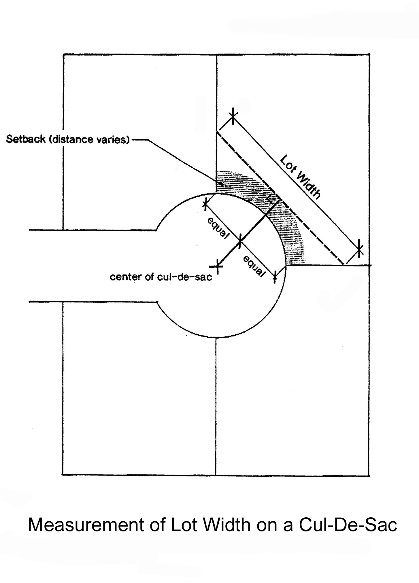 MEASUREMENT OF LOT WIDTH ON A CUL-DE-SAC (see illustration following definitions).