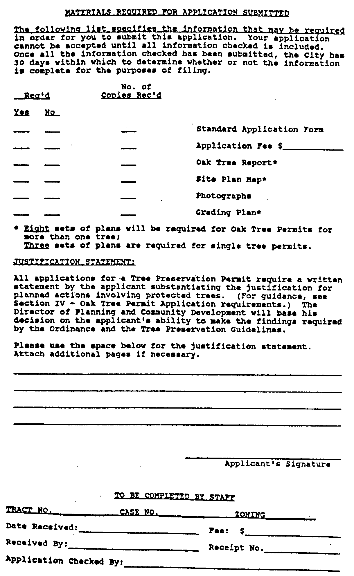 Justification statement. An application requirement, which may not be waived, is a written statement by the applicant or its oak tree preservation consultant stating the justification for planned actions involving oak trees.