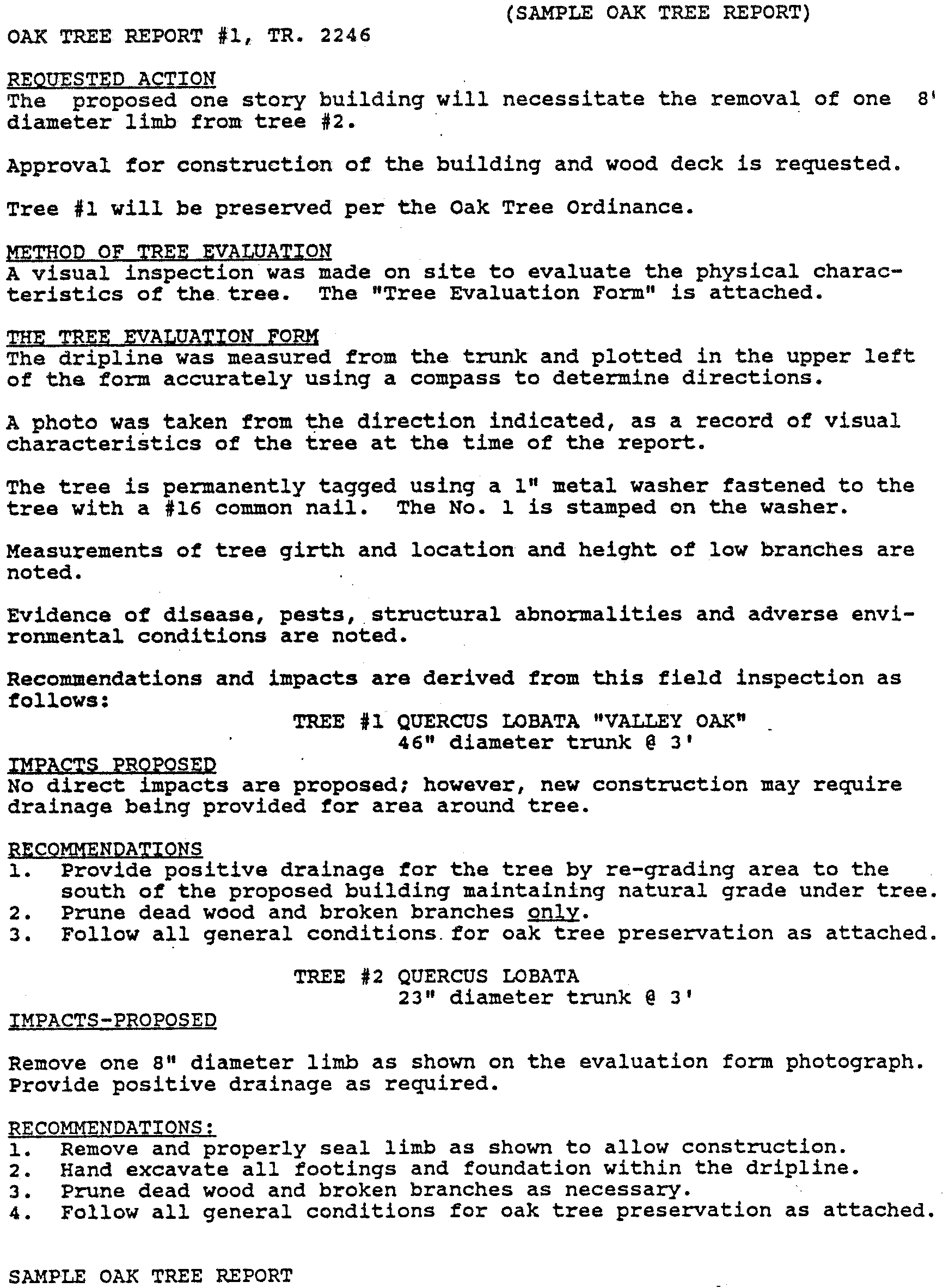 Oak tree report. A report prepared by an oak tree consultant containing specific information on the location, condition, potential impacts of development, recommended actions and mitigation measures regarding one (1) or more oak trees on an individual lot or project site.