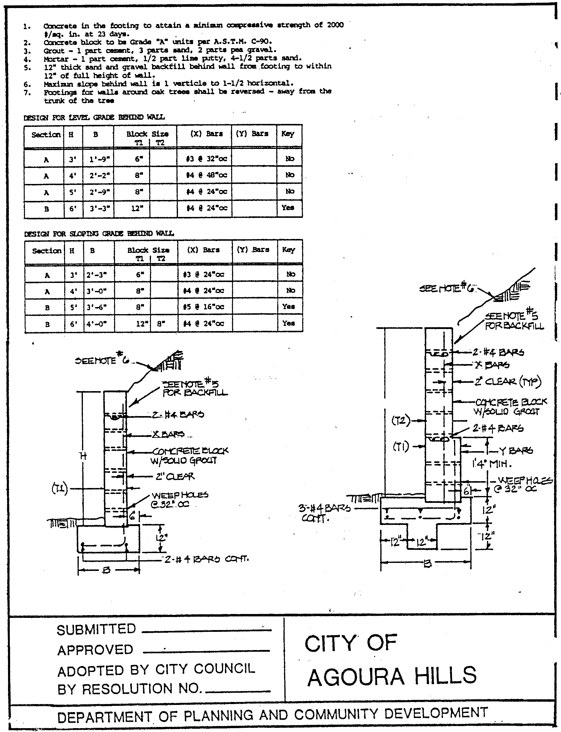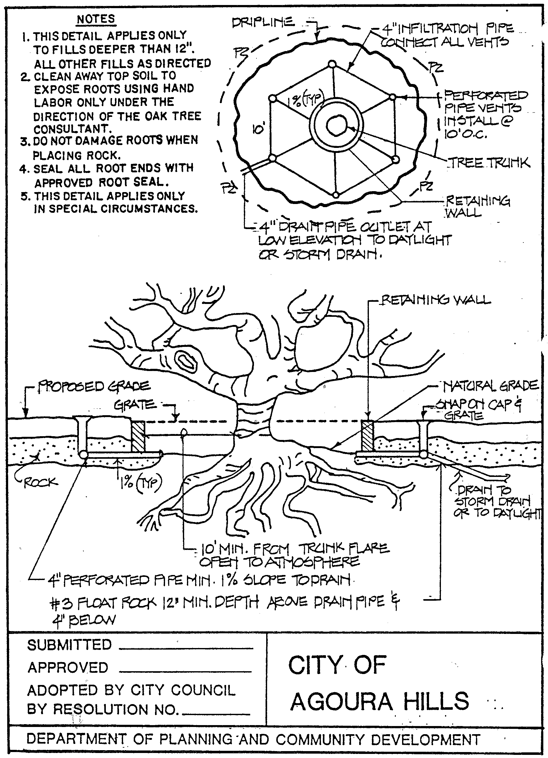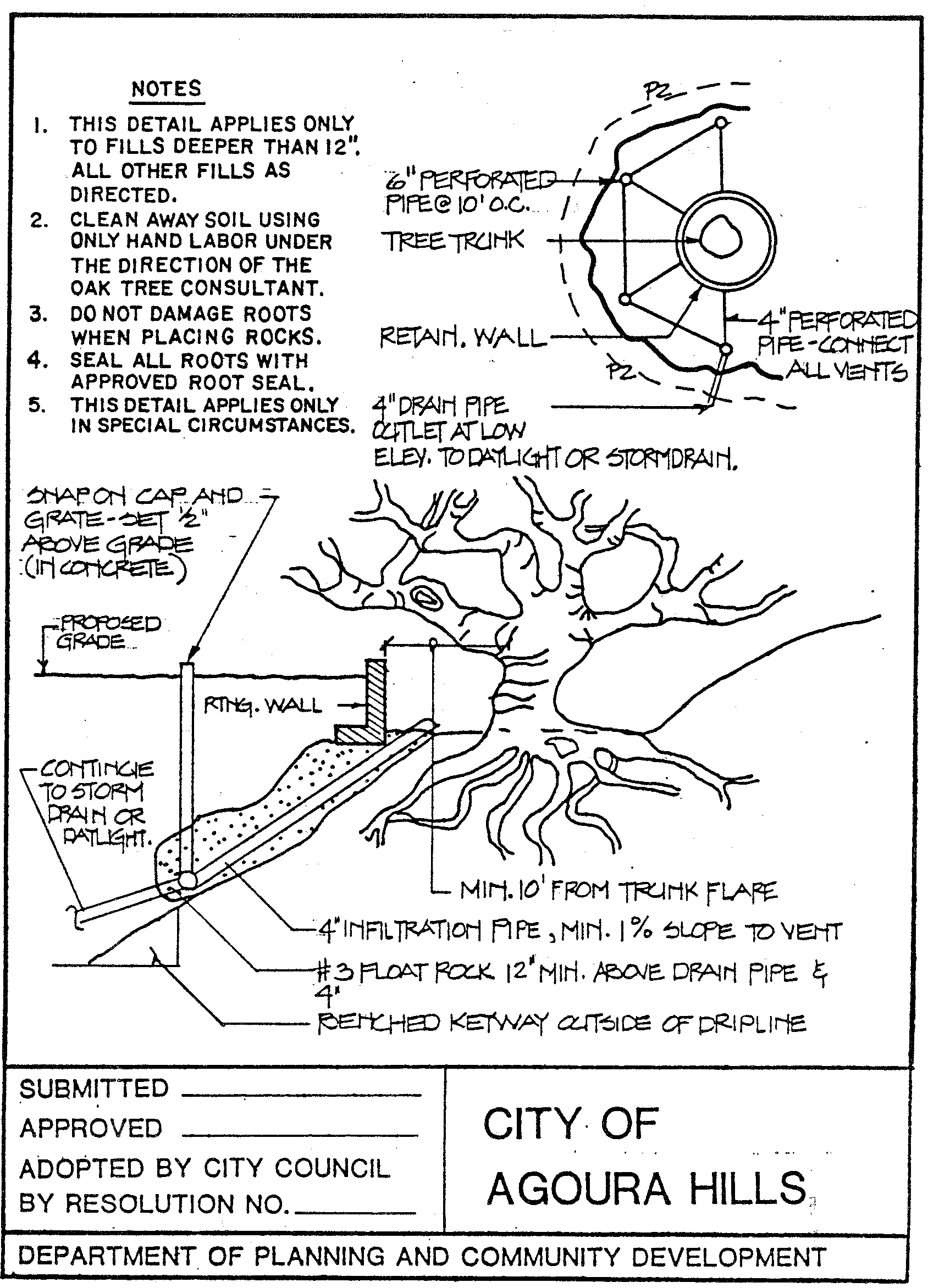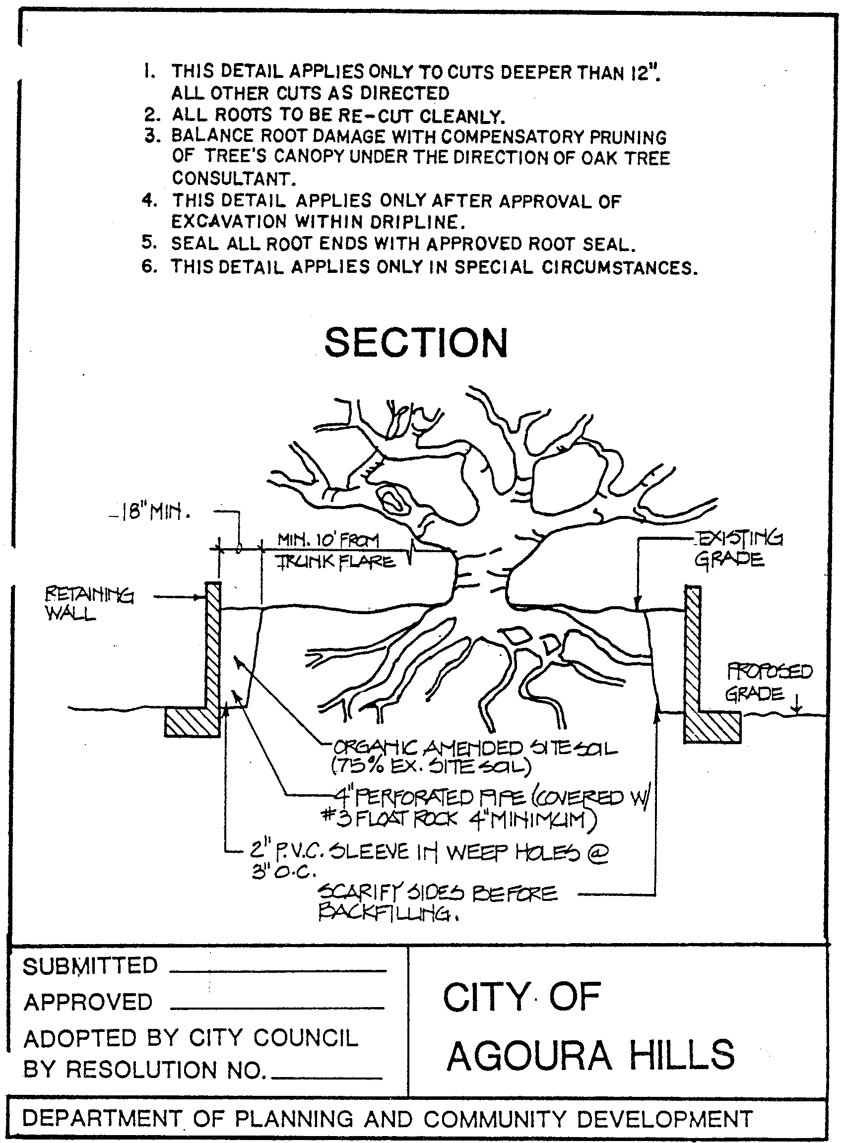 2.3. Retaining walls within the protected zone. In cases where an oak tree permit has been approved for the construction of retaining walls within the protected zone of the oak tree, the developer will be required to complete these improvements before completion of grading operations and before commencement of the construction phase. (Refer to Attachments G-1, 2 and 3 for standard details.)
