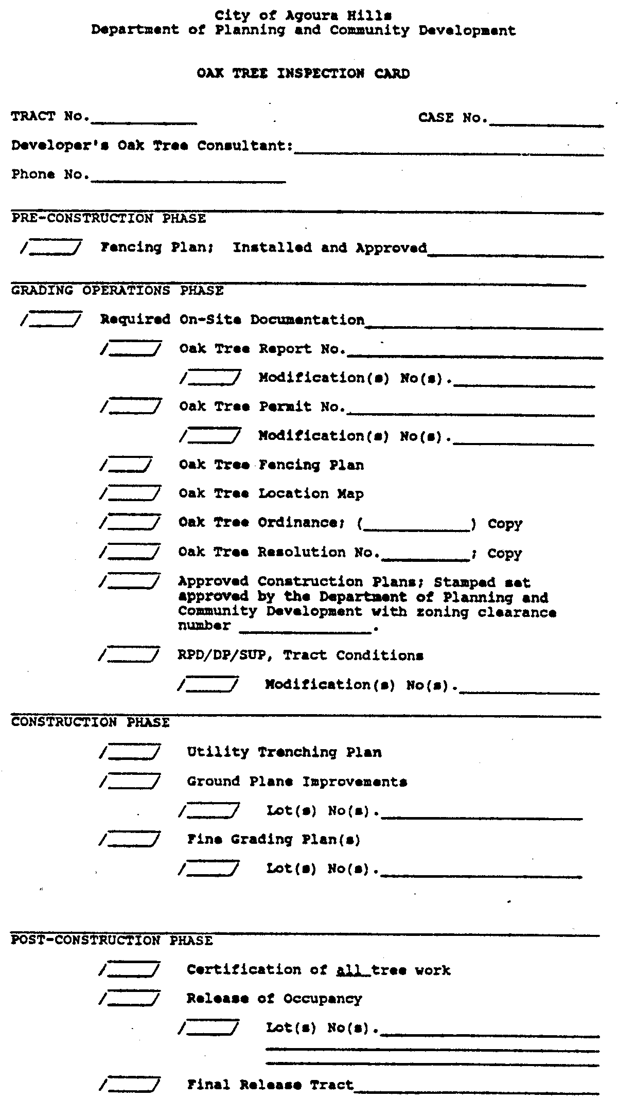 Certification of oak tree work. On all lots containing oak trees, the inspector from the Department of Planning and Community Development will require that all of the oak tree work required by the conditions of the development permit, the Oak Tree Report and the Oak Tree Permit, as applicable, have been completed and certified by the developer's oak tree preservation consultant prior to issuing a zoning clearance for release of occupancy.