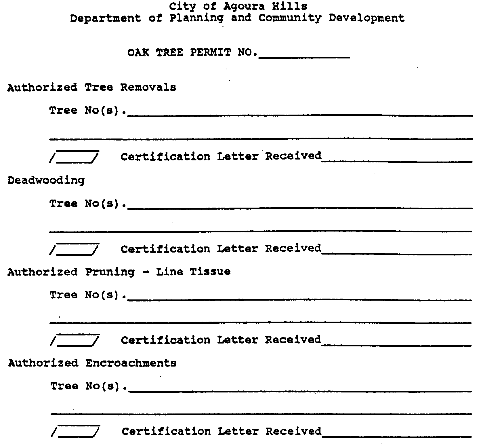 Step One: Pre-application conference. The purpose of this meeting is to familiarize the applicant with the city's permit process, to identify the information and materials necessary to file an application for an oak tree permit, and to discuss applicable policies and procedures relative to the project. A pre-application conference may be arranged by calling the department of planning and community development.