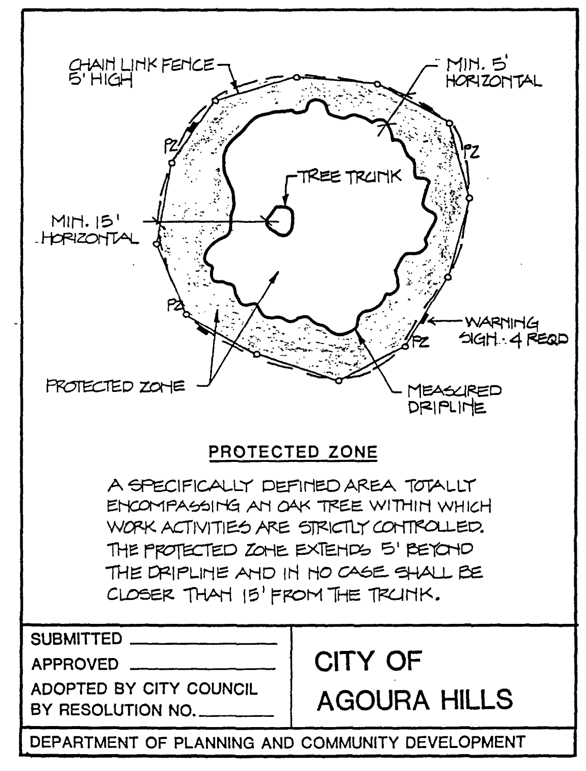Protected zone. Using the dripline as a point of reference, the protected zone shall commence at a point five (5) feet outside of the dripline and extend inwards to the trunk of the tree. In no case shall the protected zone be less than fifteen (15) feet from the trunk of an oak tree.