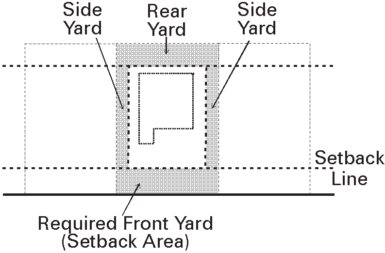 YARD, REQUIRED: Any setback area required in this Ordinance. See 4.2.1 and 4.3.1.