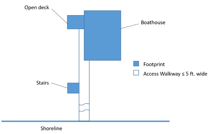 Maximum size. The maximum total footprint of a dock shall not exceed 600 square feet. For the purposes of calculating footprint size, access walkways may be excluded, provided they are no greater than five feet in width. Access walkway means that portion of the dock that extends from the upland into the water and terminates at the junction with the terminal platform (see figure below).
