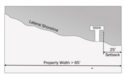 Setbacks. If the property width of the lateral shoreline is 65 feet or greater, the dock must be set back at least 25 feet from the side property lines (see figure below). If the property width at the lateral shoreline is less than 65 feet, the dock must be set back at least ten feet from the property line.