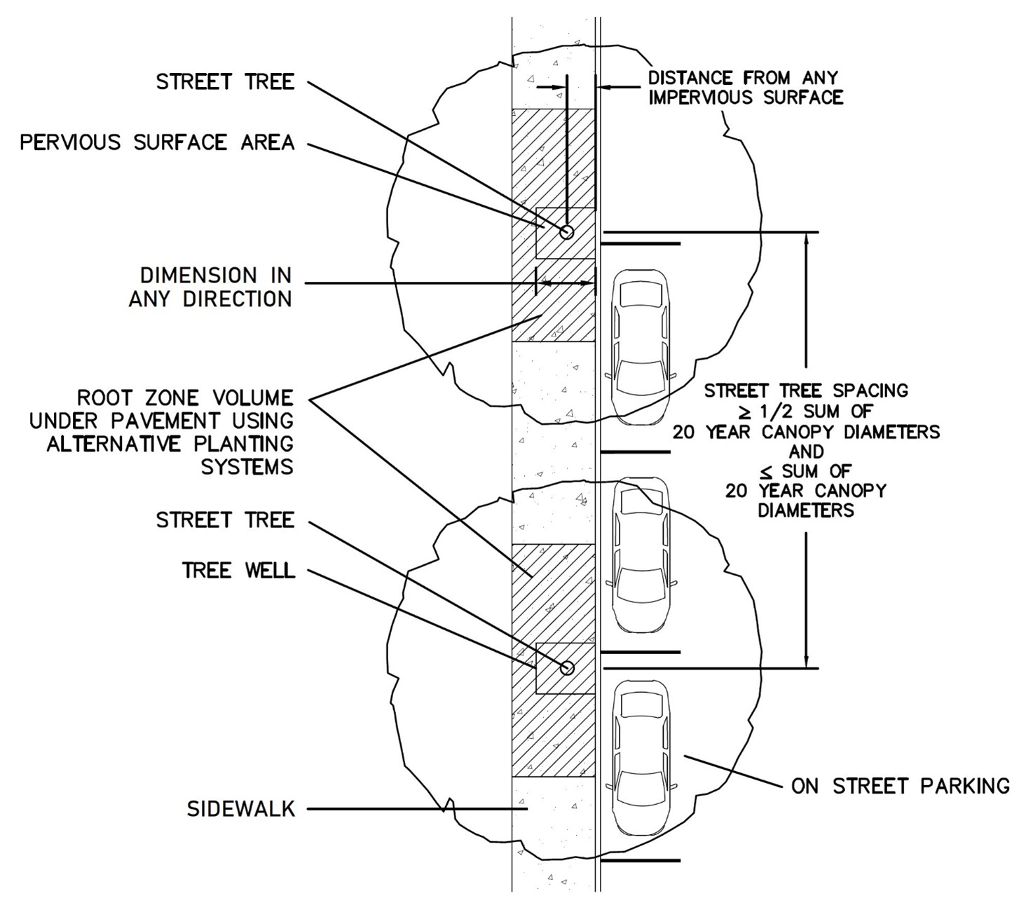 Trees, either existing or newly planted, shall be permitted in the clear space, provided that foliage is cut away within the prescribed heights.