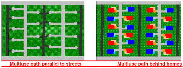 Multi-use paths. Multi-use paths shall be constructed parallel to and up to three hundred (300) feet from the roadway in an Open Space or common area. A multi-use path may satisfy the pedestrian facility requirement for two (2) parallel roadway facilities. Multi-use paths are intended to provide safe and convenient bicycle and pedestrian transportation to major attractors within a development and between developments. Multiuse paths can be placed behind homes or homes can be oriented to front multiuse paths. Appropriate access management, site distance and intersection treatments must be used wherever a multiuse path crosses an intersecting driveway or street. Development plans shall be designed to provide for safe pedestrian and bicycle circulation. The County Engineer may require deviations from this requirement due to public safety concerns. In no instance shall a pedestrian facility be eliminated entirely from a street corridor. Multi-use paths shall conform to the following standards.