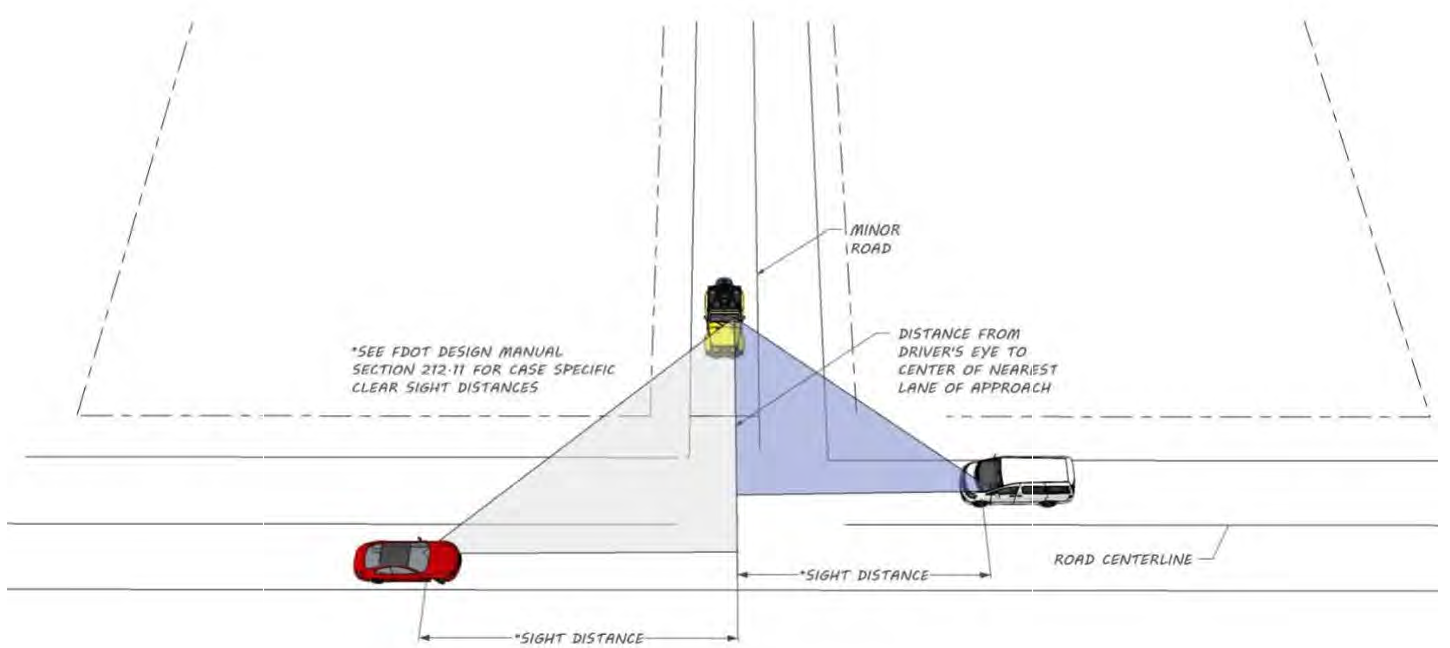Within the area formed by the rights-of-way lines of intersecting roads and a straight line connecting points on such rights-of-way lines there shall be a clear space with no obstruction to vision between the height of three (3) feet and a height of eight (8) feet above the average grade of each road as measured at the centerline that is consistent with criteria outlined in the Florida Department of Transportation's Manual of Uniform Minimum Standards for Design, Construction and Maintenance for Streets and Highways.