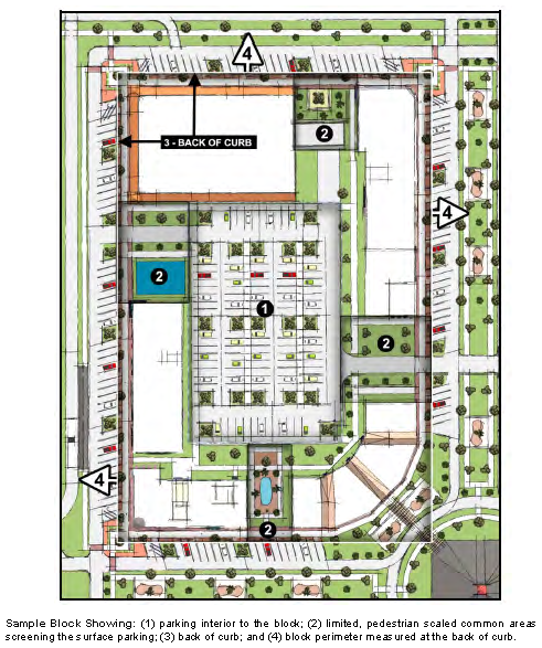 Maximize resident and pedestrian oriented outdoor spaces while minimizing the impact of automobile traffic and parking.
