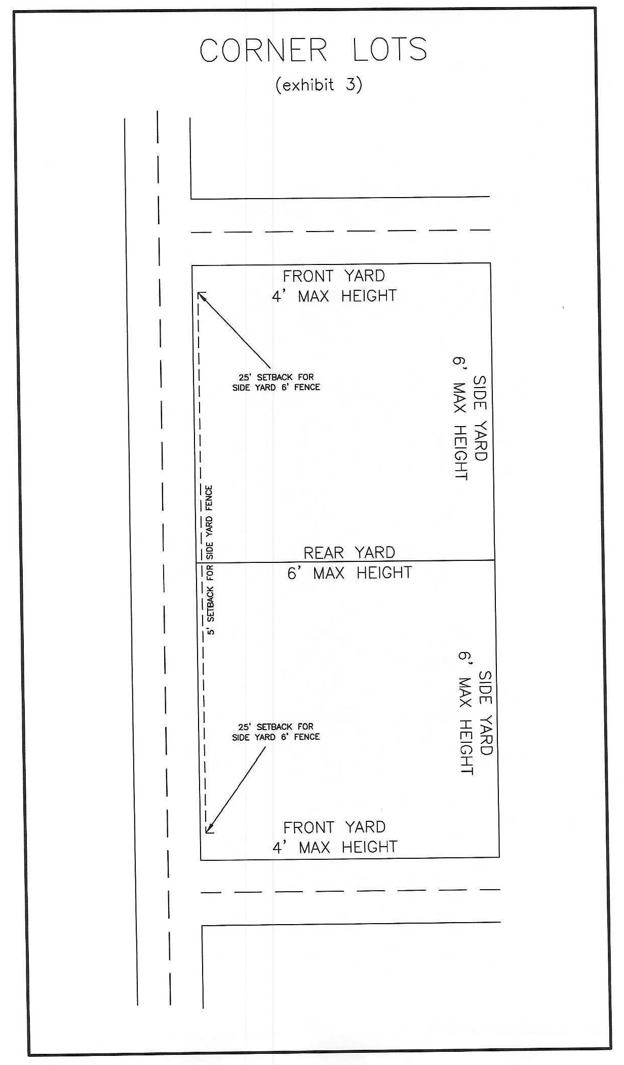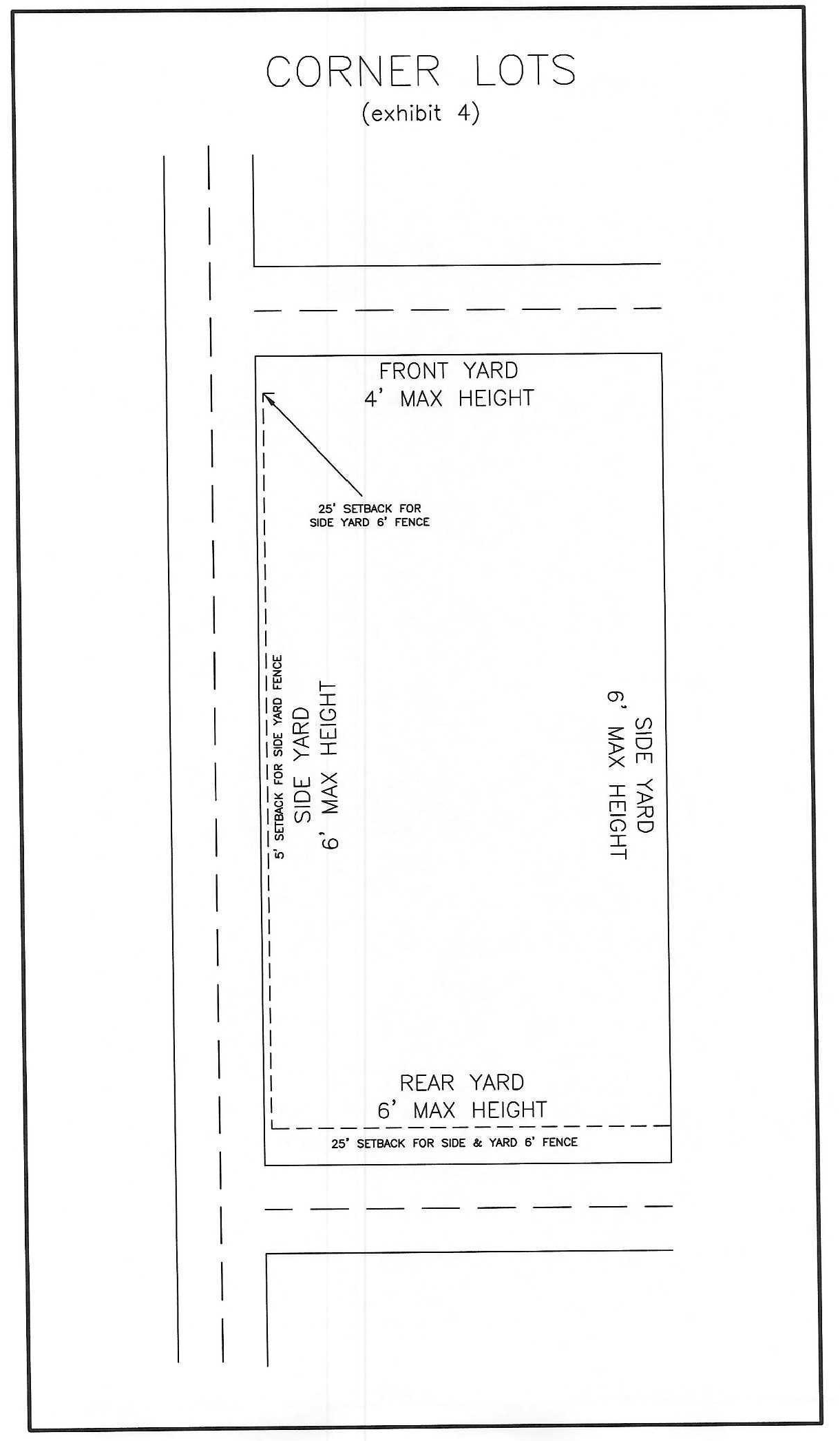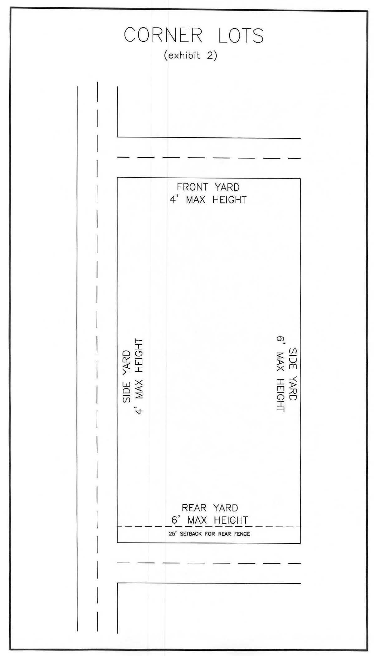 Corner lots with rear yard abutting the street may have a six-foot solid fence setback at least five feet from street side yard property line and 25 feet from rear yard facing street property line. (See attached diagram.)