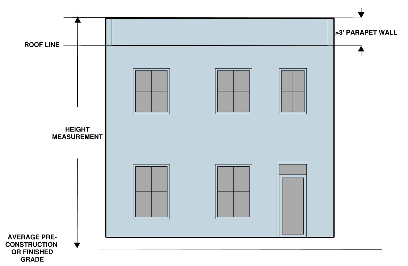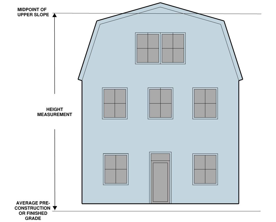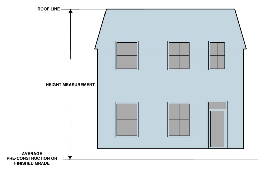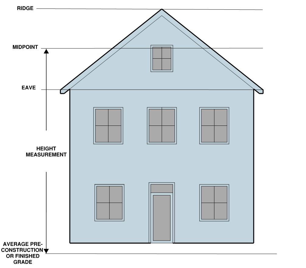 The ratio of the horizontal distance between any part of a building or structure and the nearest side or rear property line or the nearest building or the center line of a street or alley to the height of that part of the building above average finished grade of such line, except that for buildings in the R-20, R-12, R-8, R-5, R-2-5 and single-unit and two-unit dwellings in the RA and RB zones not including property located within the Old and Historic Alexandria and Parker-Gray Districts, height shall be measured from the average pre-construction grade of such line.