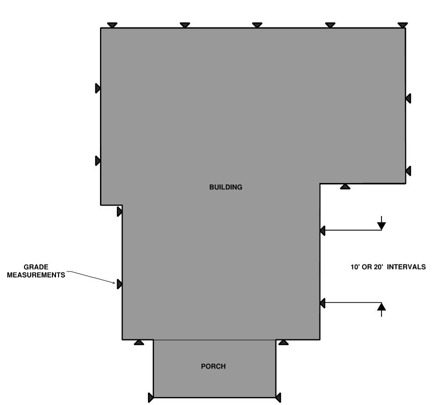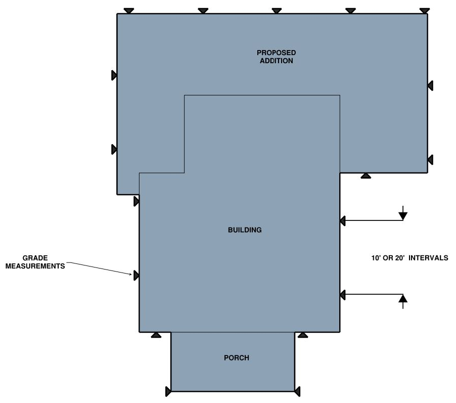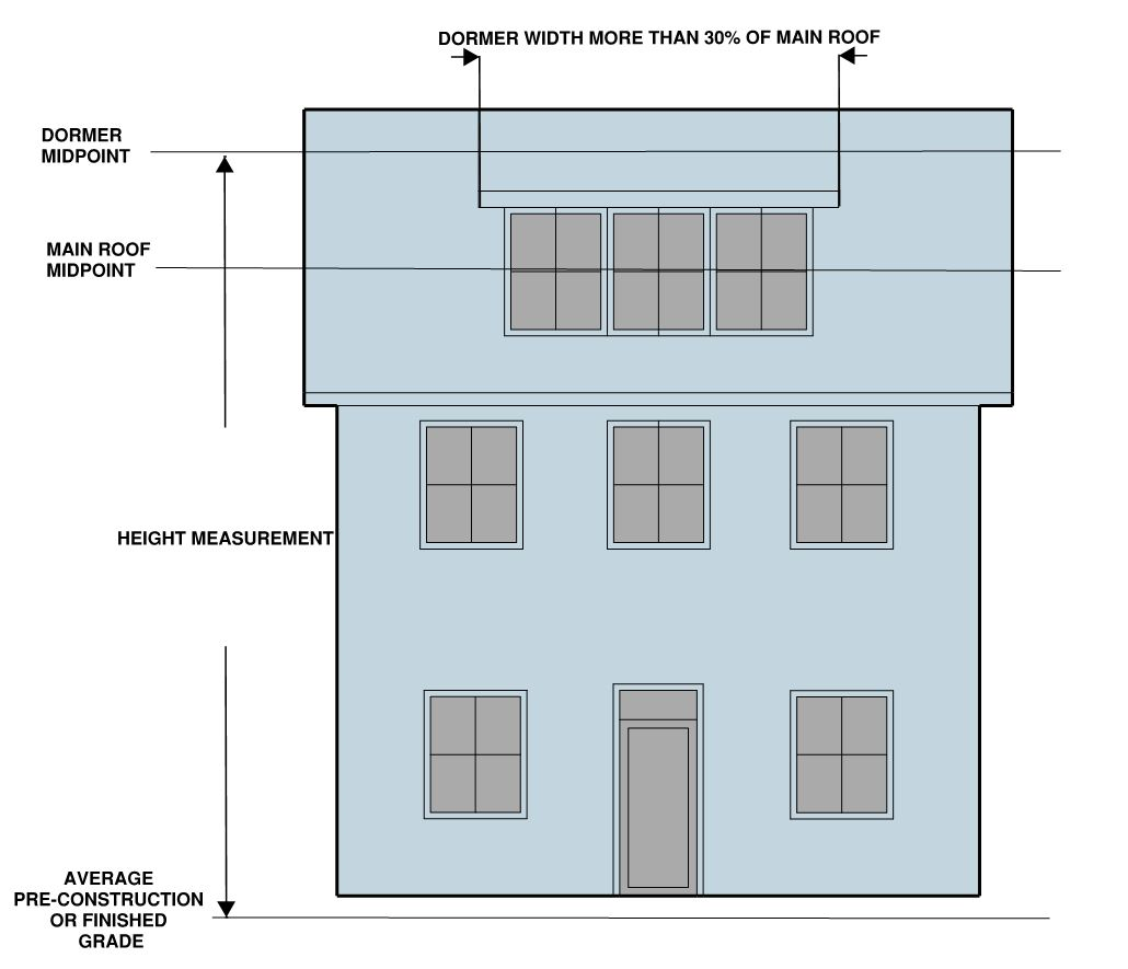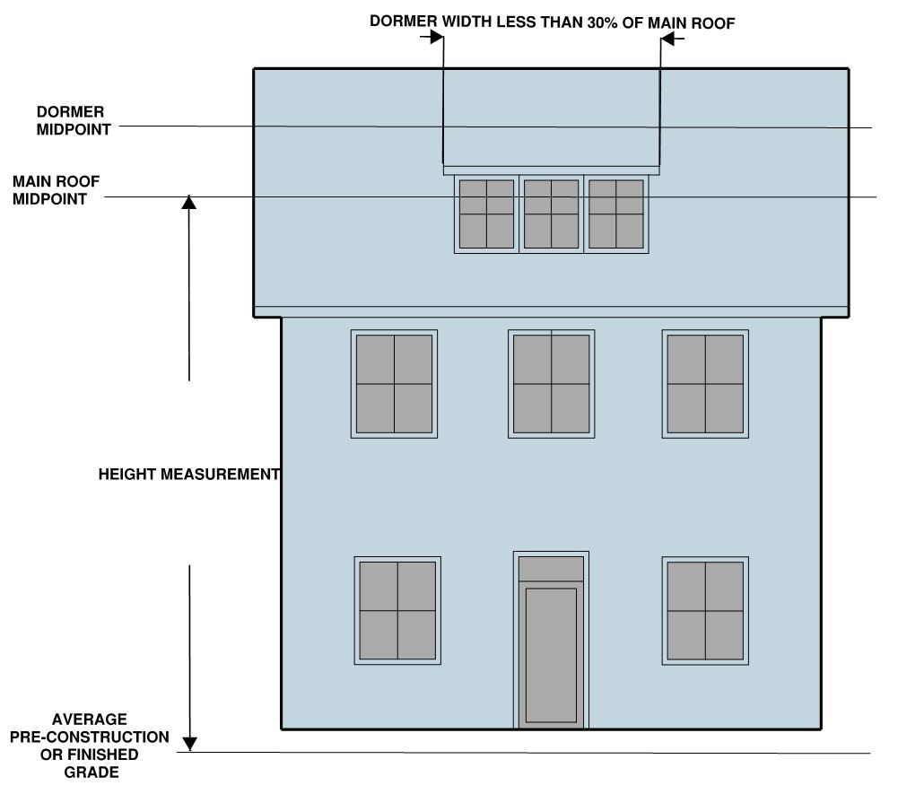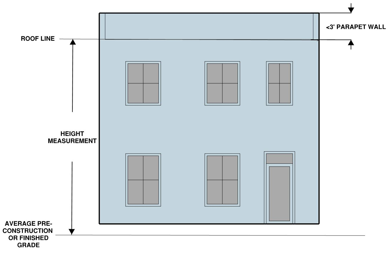 The ratio of the horizontal distance between any part of a building or structure and the nearest side or rear property line or the nearest building or the center line of a street or alley to the height of that part of the building above average finished grade of such line, except that for buildings in the R-20, R-12, R-8, R-5, R-2-5 and single-unit and two-unit dwellings in the RA and RB zones not including property located within the Old and Historic Alexandria and Parker-Gray Districts, height shall be measured from the average pre-construction grade of such line.