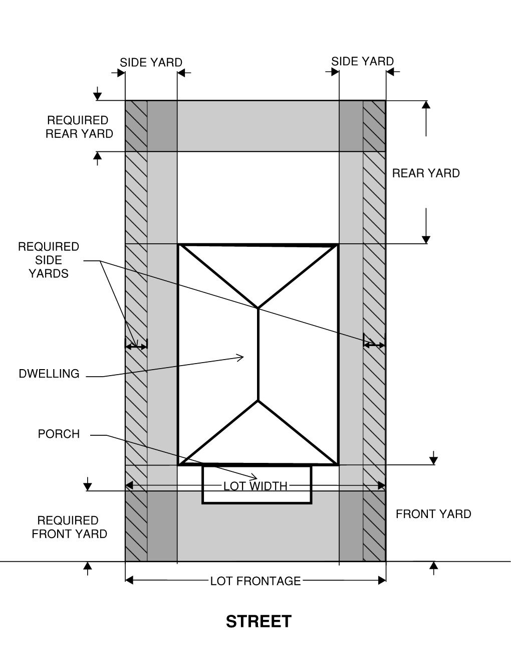 A yard extending across the width of a lot between the front lot line and the main building or any projection thereof not permitted in section 7-202. For a corner lot, the two yards lying between the main building and the intersecting streets shall both be deemed to be front yards and any additional yards shall be deemed to be side yards. For a through lot, the two or more yards lying between the main building and the two or more public streets shall be deemed to be front yards.