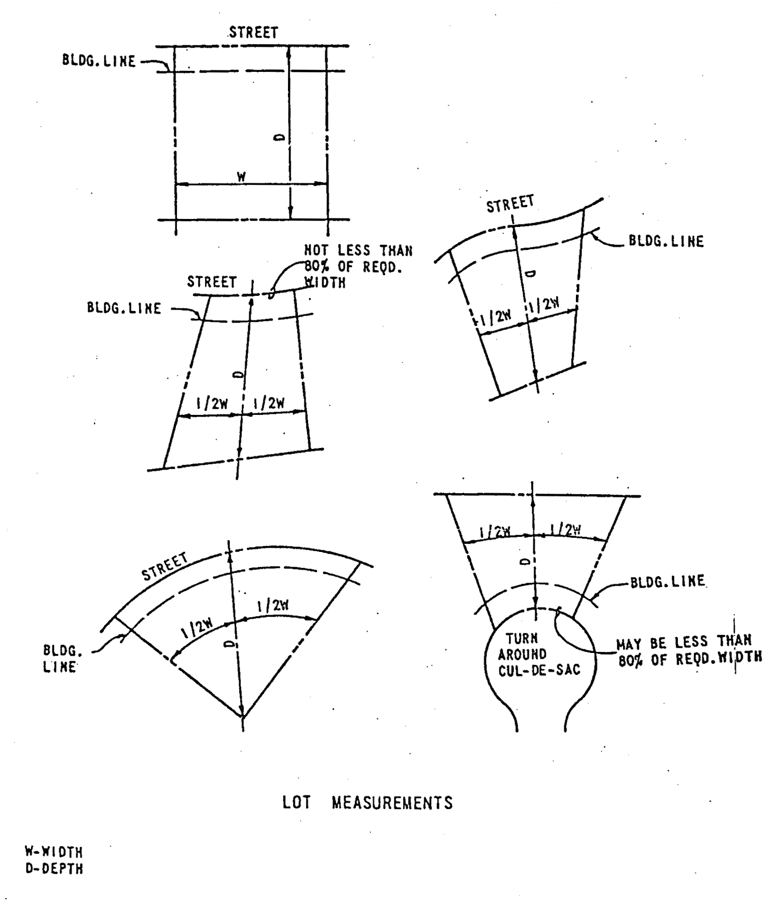 Width of a lot shall be considered to be the distance between straight lines connecting front and rear lot lines at each side of the lot, measured across the rear of the required front yard; provided, however, that width between side lot lines at their foremost points (where they intersect with the street line) shall not be less than 80 percent of the required lot width except in the case of lots on the turning circle of cul-de-sac, where the 80 percent requirement shall not apply.