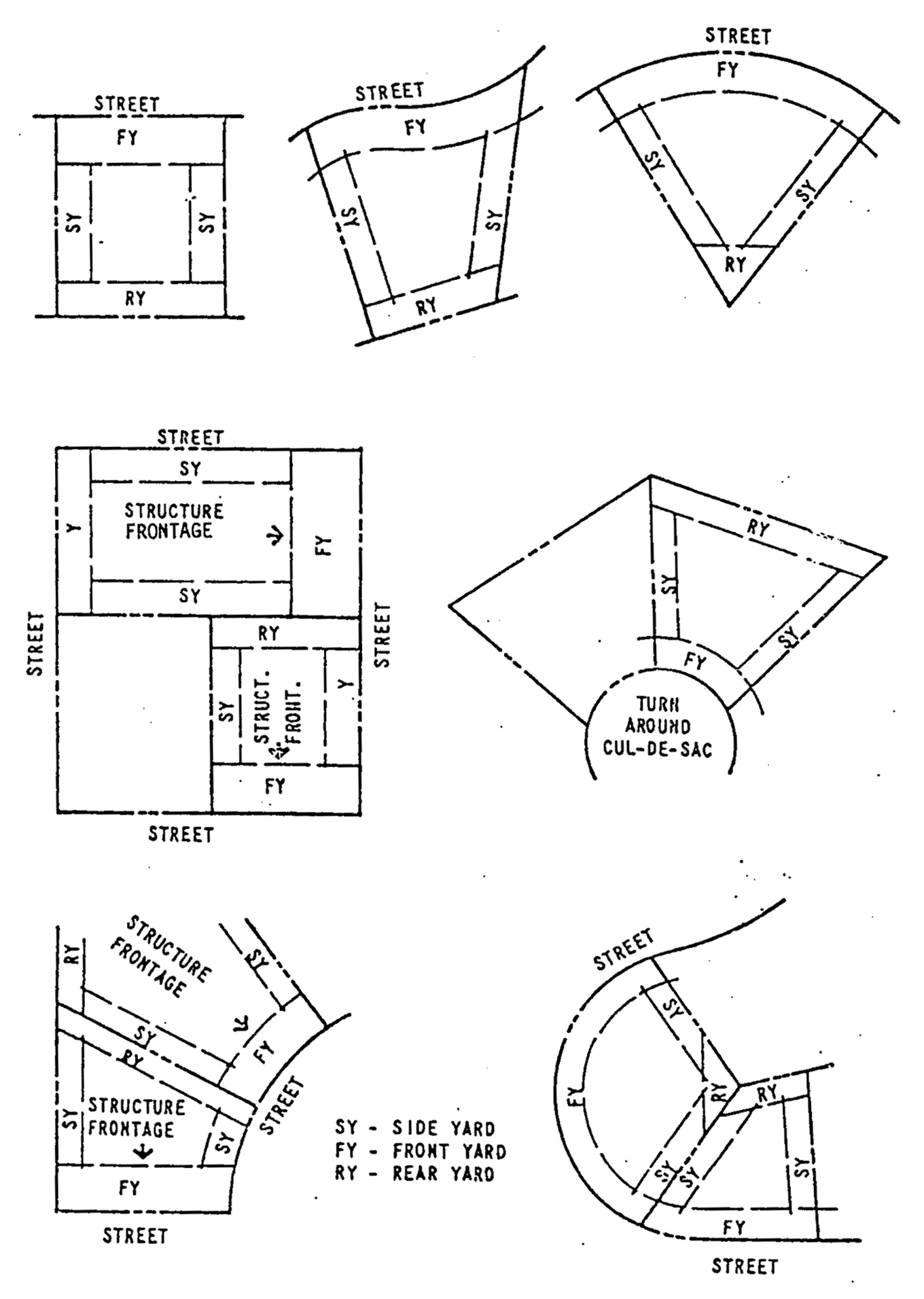 Yard, side. A yard extending from the rear line of the required front yard to the rear lot line, or in the absence of any clearly defined rear lot line to the point on the lot farthest from the intersection of the lot line involved with the public street. In the case of through lots, side yards shall extend from the rear lines of front yards required. In the case of corner lots, yards remaining after full and half-depth front yards have been established shall be considered side yards. Width of a required side yard shall be measured in such a manner that the yard established is a strip of the minimum width required by district regulations with its inner edge parallel with the side lot line.