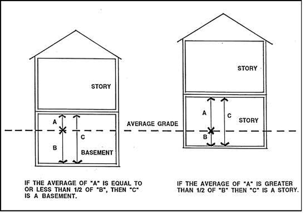 Basement. A space having not more than half of its height above the average level of the adjoining ground. A basement shall be counted as a story for the purposes of height measurement if the vertical distance between the ceiling and the average level of the adjoining ground is more than five feet or if used for business or dwelling purposes (see figure 1).
