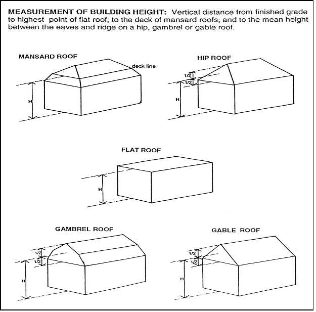 Building height. The building height is the vertical distance measured from the established grade reference level to the highest point of the roof surface if a flat roof, to the deck of mansard roofs, and to the mean height level between eaves and ridge for gables, hip and gambrel roofs. Where the building may be situated on sloping terrain, this height may be measured from the average ground level of the grade at the building wall (see figure 2).