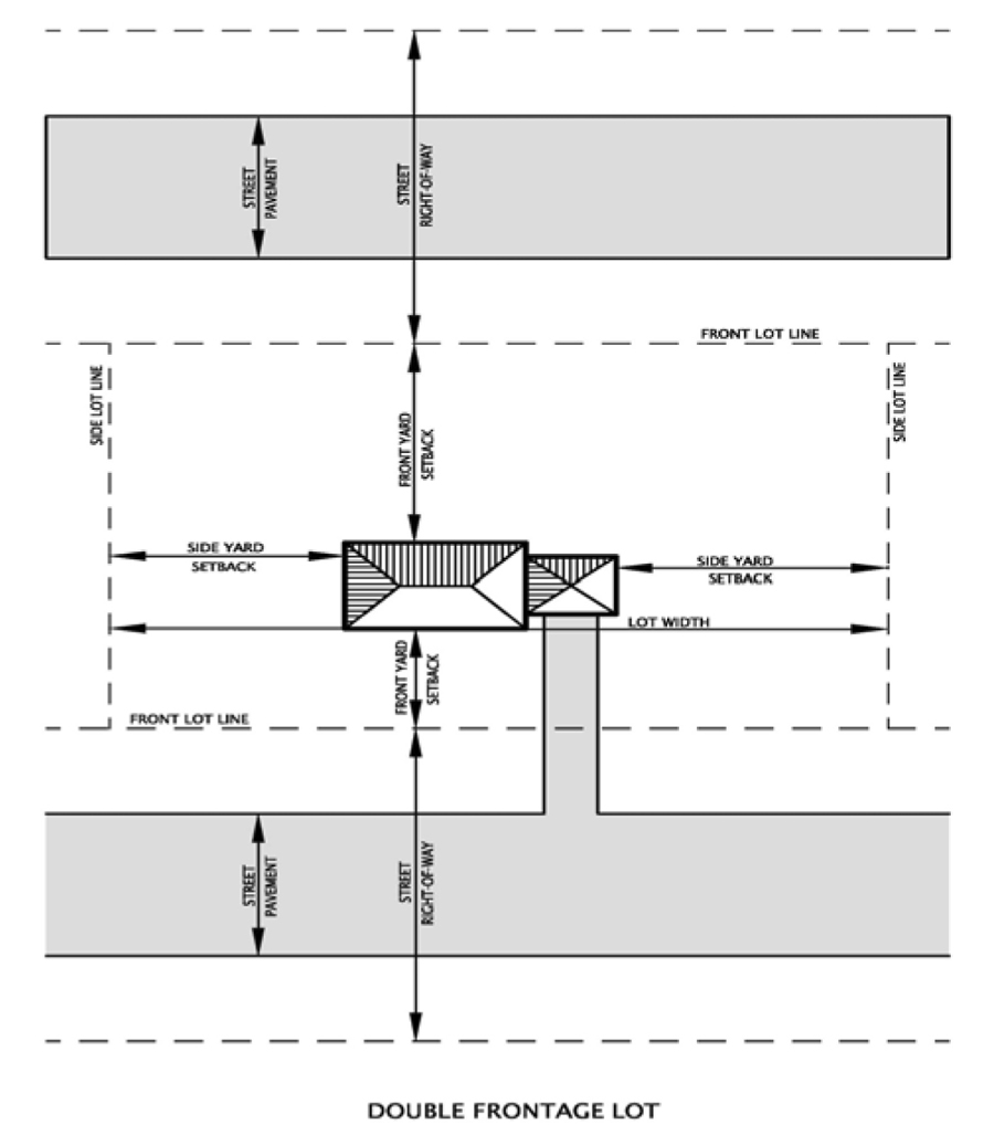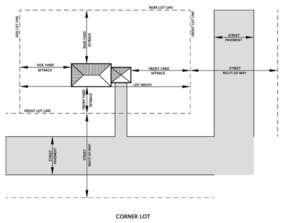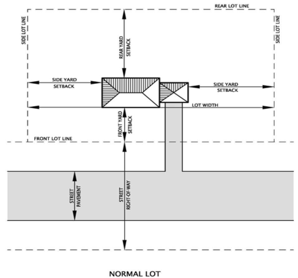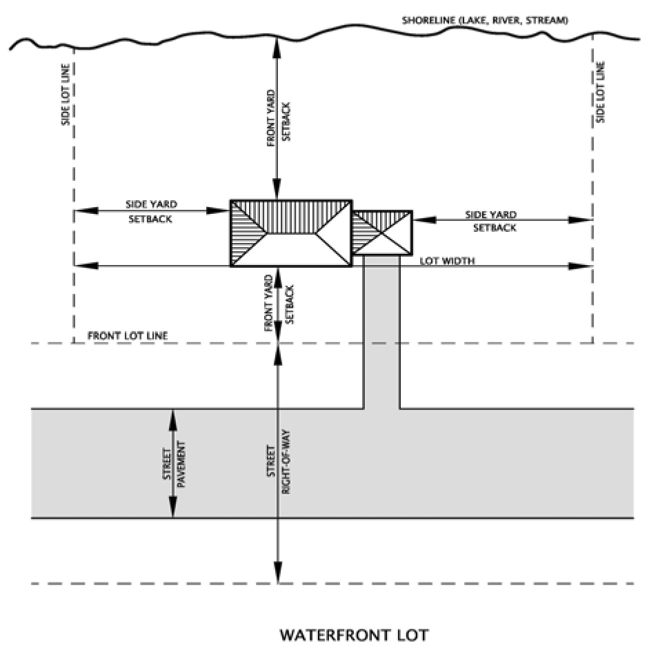 Yard, front, street and waterfront. Front yards or setbacks from street right-of-way lines and shorelines of water bodies (see figure 7).