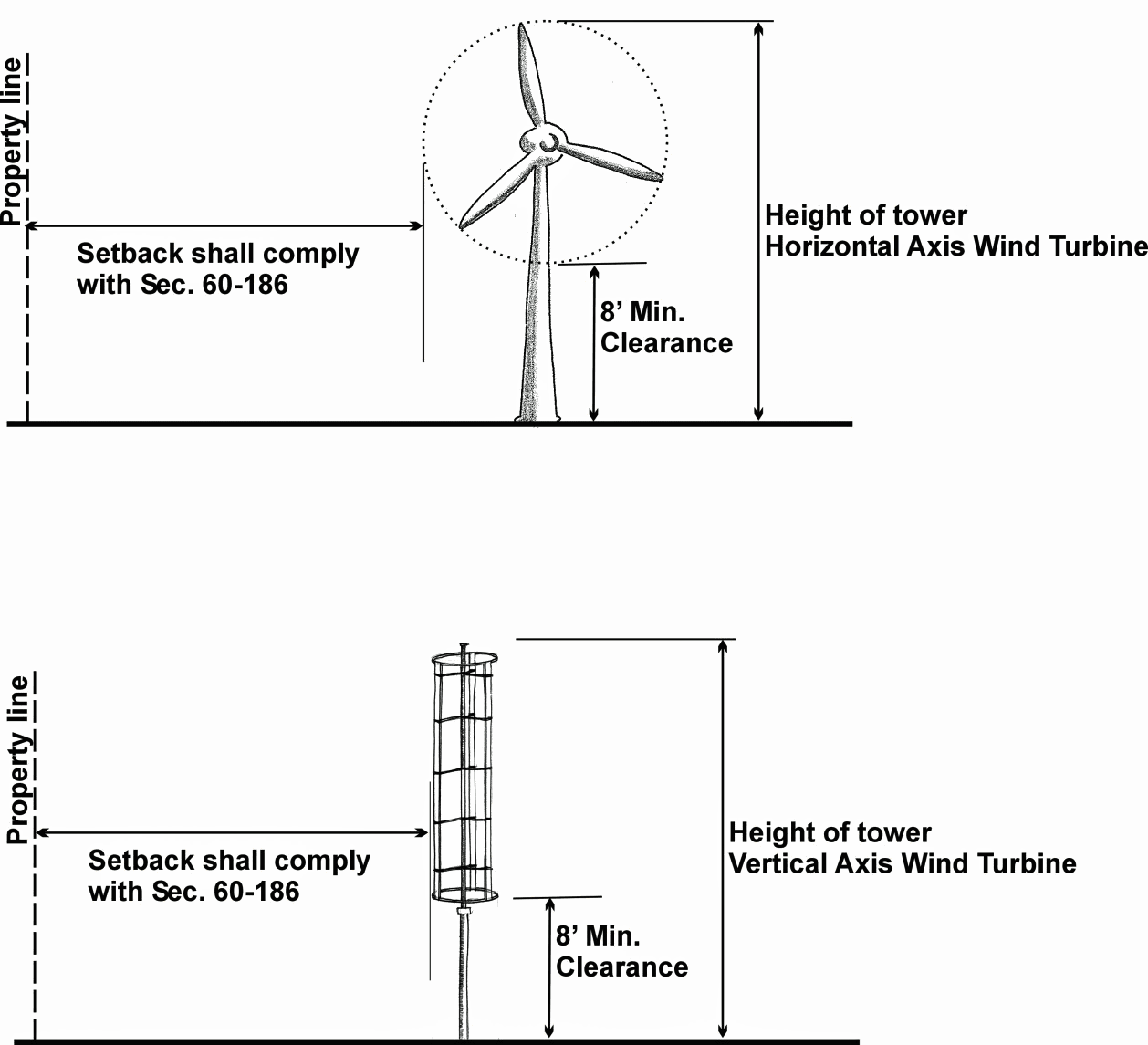 Safety. All moving parts including blades or rotating cylinders shall be located at least eight feet above the ground and a safe distance from human interference (See figure 60-186). The support system, footings and tower shall be constructed in accordance with all applicable building codes governing structural integrity and wind loads.