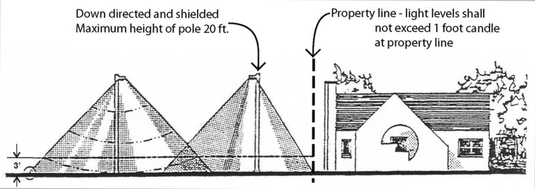 Parking area illumination. All illumination for or on all such parking lots shall be deflected away from adjacent premises and public streets. All site lighting shall be down directed and shielded. Light levels shall not exceed one footcandle at perimeter property lines. The maximum height of parking lot light fixtures and poles shall be 20 feet (see figure 9).