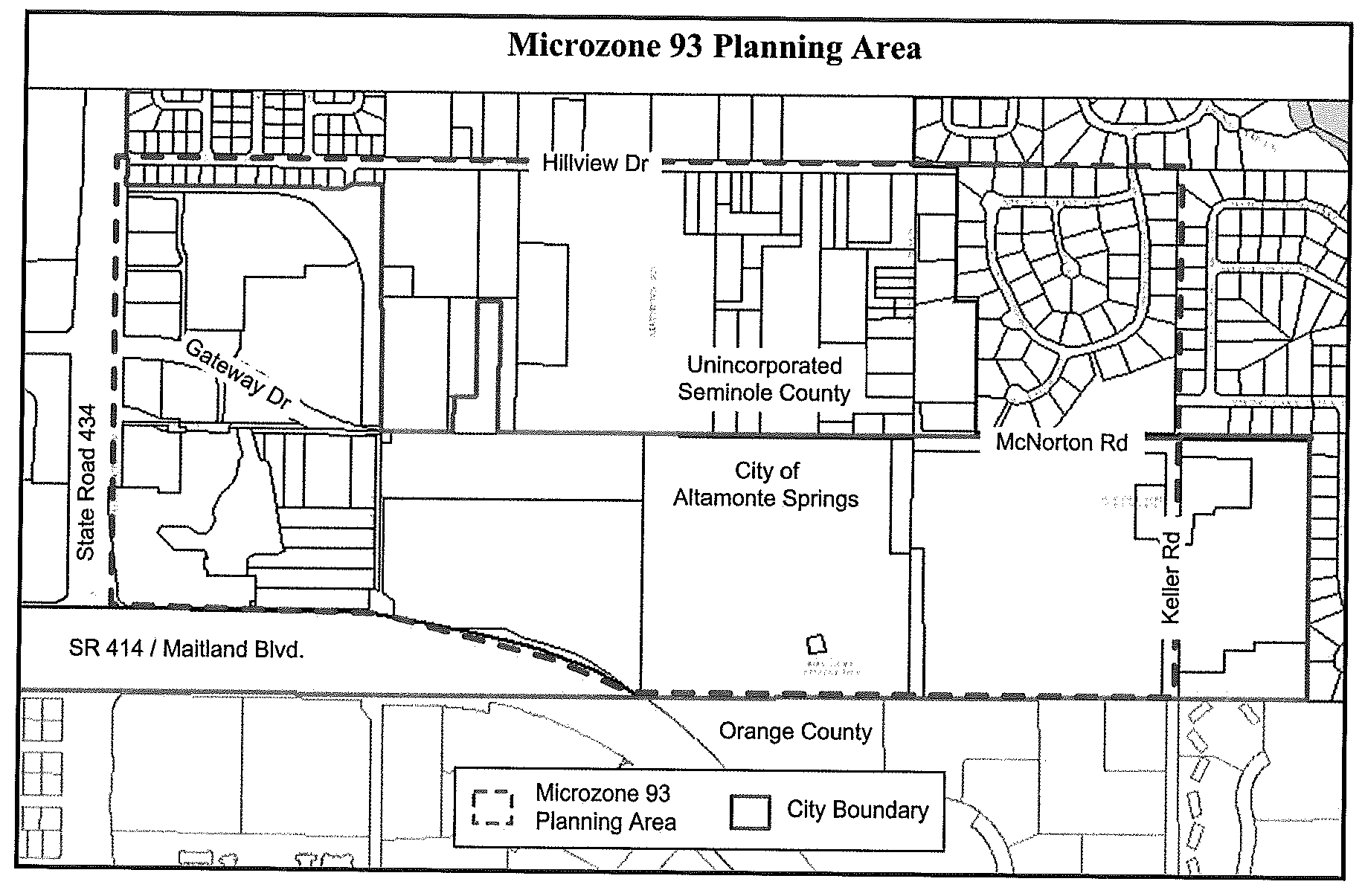 The multi-use development (MUD) future land use and zoning shall be permitted on parcels which are within the MicroZone 93 Planning Area, as illustrated on the map shown below. Only parcels which are within the MicroZone 93 Planning Area and which are contiguous to existing multi-use development districts will be eligible for this zoning district.