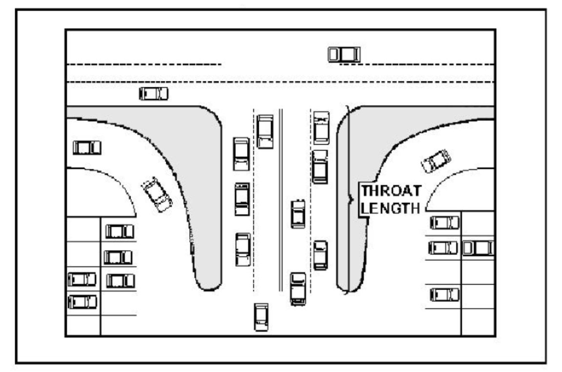 Driveways shall have sufficient length and size for all vehicular queuing, stacking, maneuvering, standing, and parking to be carried out completely beyond the right of way line. The length of driveways, or throat length, shall be designed in accordance with table 24-429. These measures generally are acceptable for the principal access to a property and are not intended for any minor supplemental driveways to that same property.