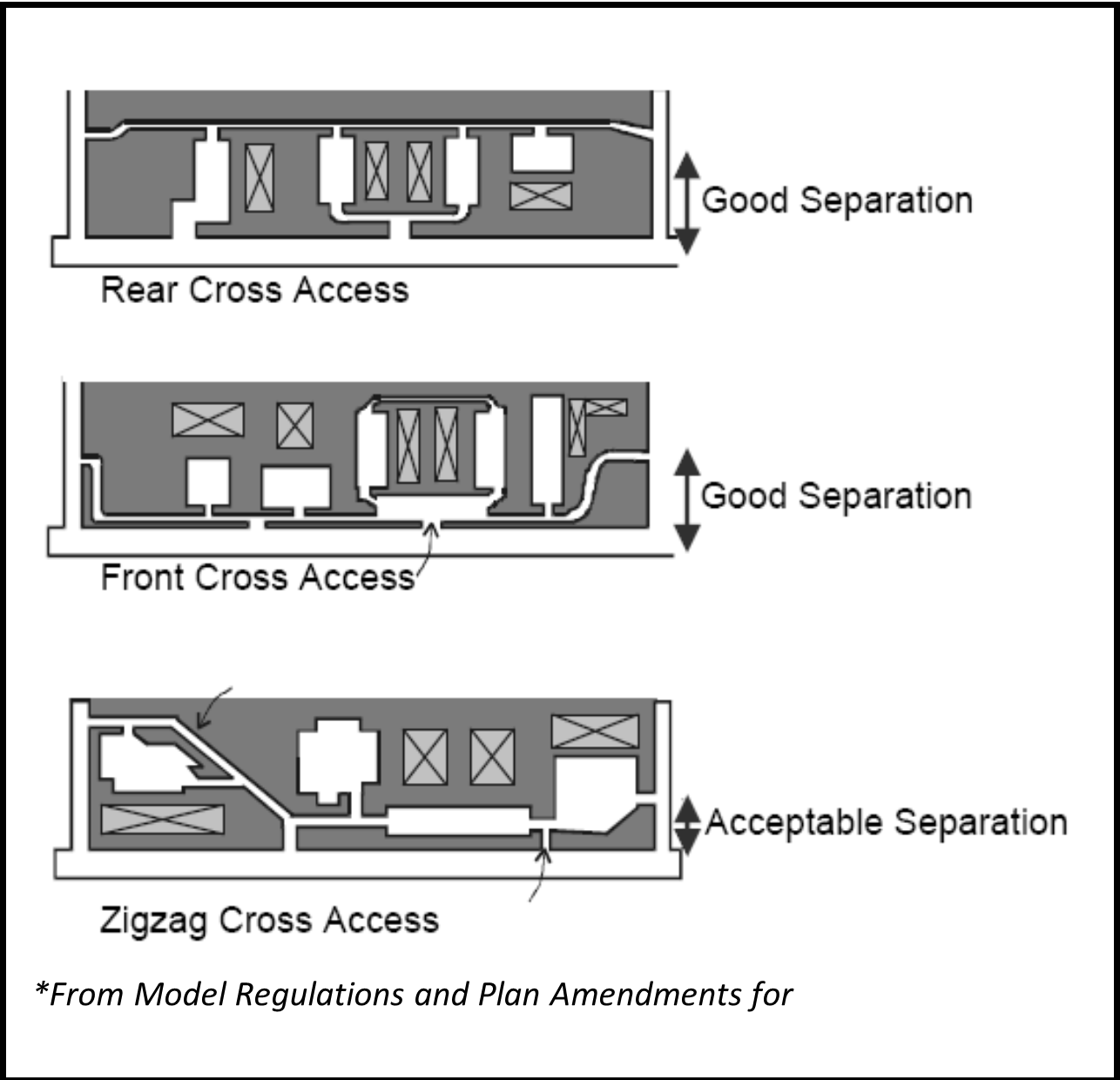 Stub roads and other design features to make it visually obvious that the abutting properties may be tied in to provide cross access via a service drive.