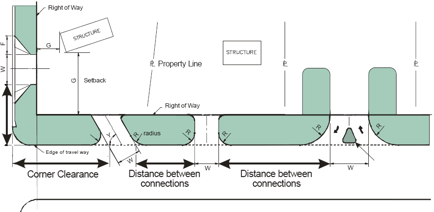 Corner clearance for connections shall be measured from the closest edge of pavement of the intersection to the next closest edge of pavement of the first access point from the intersection (see Figure 24-434).