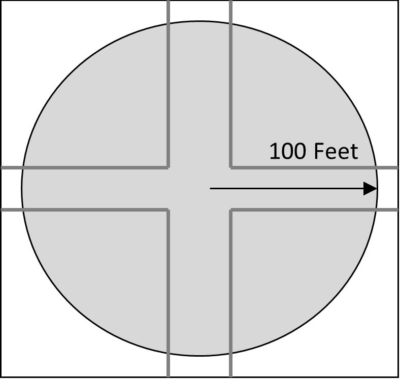 Key locations within the traffic impact overlay have been identified for the future installation of traffic calming devices, preferably roundabouts. The intersections targeted for these devices are at South Main Street and Lancer Lane, South Main Street and the U.S. Route 29 Bypass ramps, and South Main Street and the northern most entrance to the Ambriar Shopping Center. There shall be a 200-feet-in-diameter limit of use designation that is measured from the center point (see Figure 24-436) of the intersections listed above.