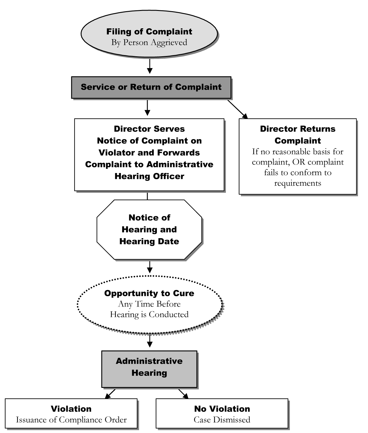 Filing of complaint. A private enforcement action is commenced upon filing of a written complaint to the director by a person aggrieved by a violation described in subsection 21.14.060B. The complaint must include the following information: