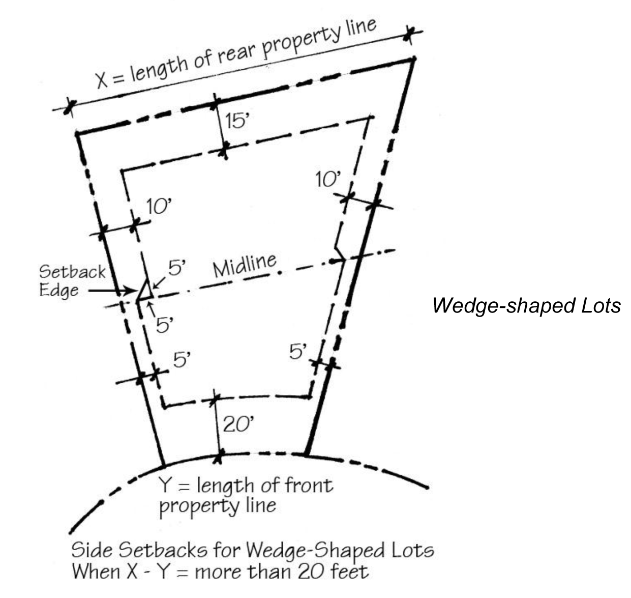 Lot shape, residential districts. For wedge-shaped lots <e; 15,000 square feet, if the difference in lot width is greater than 20 feet from front to back, the ten-foot side setback in subsection 21.09.060 A.1. shall apply in the wider half of the lot. In the narrower half of the lot, the side setback shall be five feet. For purposes of this subsection, the boundary between the two halves of the lot shall be determined by locating a line midway between the front and rear lot boundaries. The five foot setback in the front half of the lot shall transition into the ten-foot setback in the rear half of the lot as shown in the figure below. This provision supersedes the side and rear setback flexibility in note 2 of Table 21.09-5.