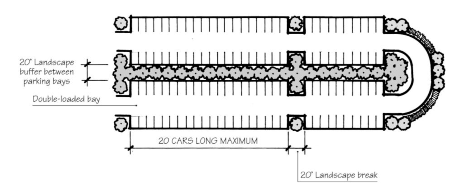 Parking. Detached garages, carports, and parking garages shall be designed with architectural elements and materials related to the principal commercial building or buildings, and shall be screened from view from public roads and primary common areas with landscaping and/or berming.