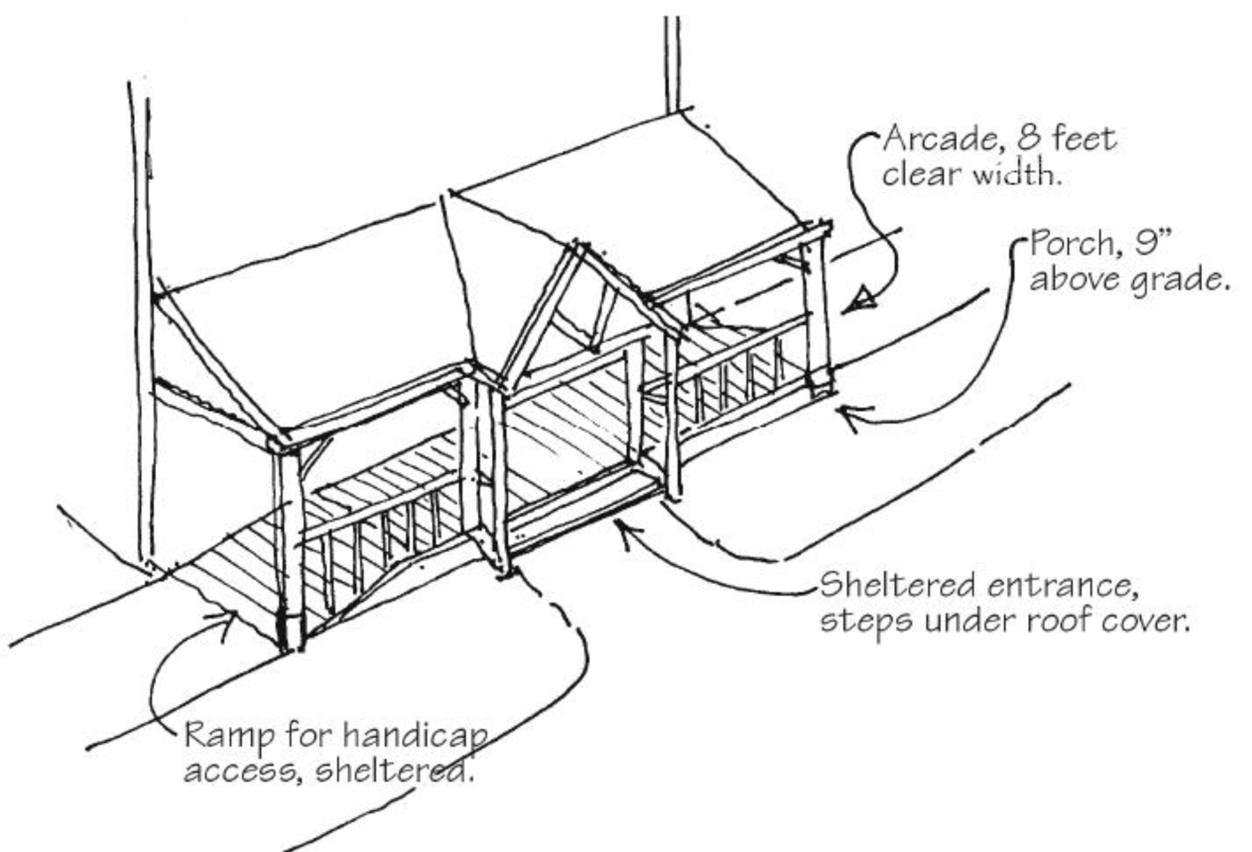 Porches, entrances, arcades, and roofed walkways. A key element of Girdwood mountain style for commercial, community and resort buildings is the use of porches with shed roofs to define entrances. To the maximum extent feasible, all buildings shall utilize porches constructed in accordance with the following standards: