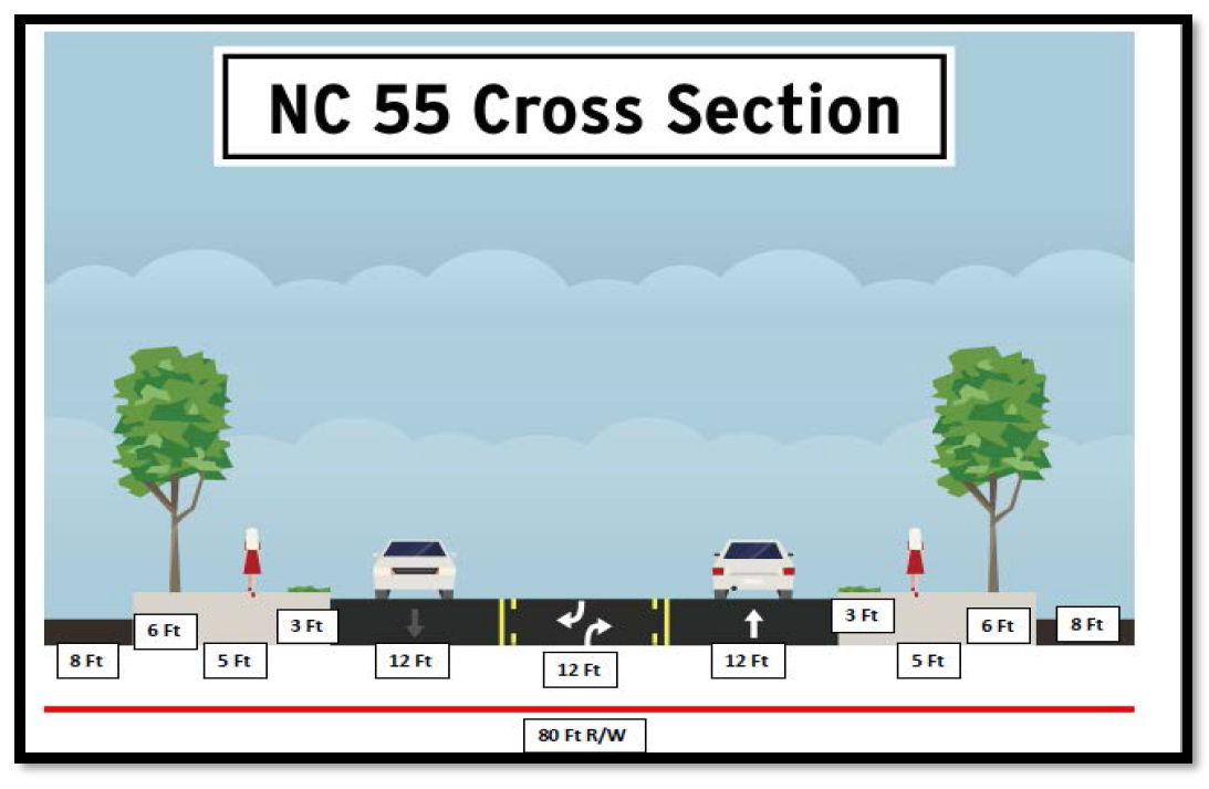 For the purposes of these requirements, the "cross section" shall be an 80-foot right-of-way section, applicable along Highway 55 between Lagenaria Drive and Old Buies Creek Road. All proposed development adjacent to the Highway 55 corridor shall be responsible for dedicating the required portion of right-of-way in accordance with section 9.1.7.