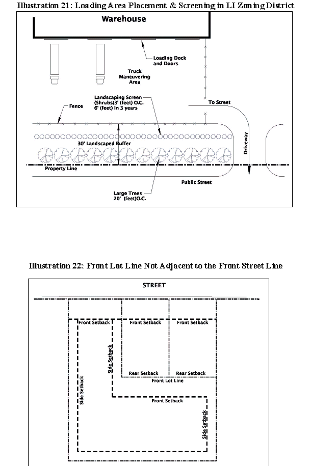 For large industrial or warehouse uses in the LI zoning district only, the loading docks may face a public street, and shall not be required to provide a masonry screening wing wall, provided that a minimum 30-foot wide landscape buffer area is provided adjacent to the street right-of-way line. One large shade trees shall be provided within the landscape buffer area for every 20 feet of street frontage, or one small ornamental tree shall be provided for every 12 feet of street frontage (or some combination thereof). In addition, a solid massing of large evergreen shrubs and three- to four-foot tall berms shall be provided to further screen loading area from view of the street (see illustration 21).