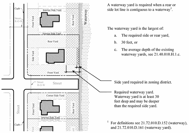 Notwithstanding any other yard requirements set forth in this division, where any side or rear lot line is contiguous to a waterway, a waterway yard shall be provided which is the largest of: