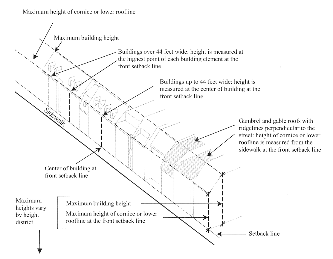 For gambrel and gable roofs with ridge lines perpendicular to the street, the height of a cornice or lower roofline will be measured at the side wall at the front setback line, and the height of the building at its highest point will be measured at the ridge line.