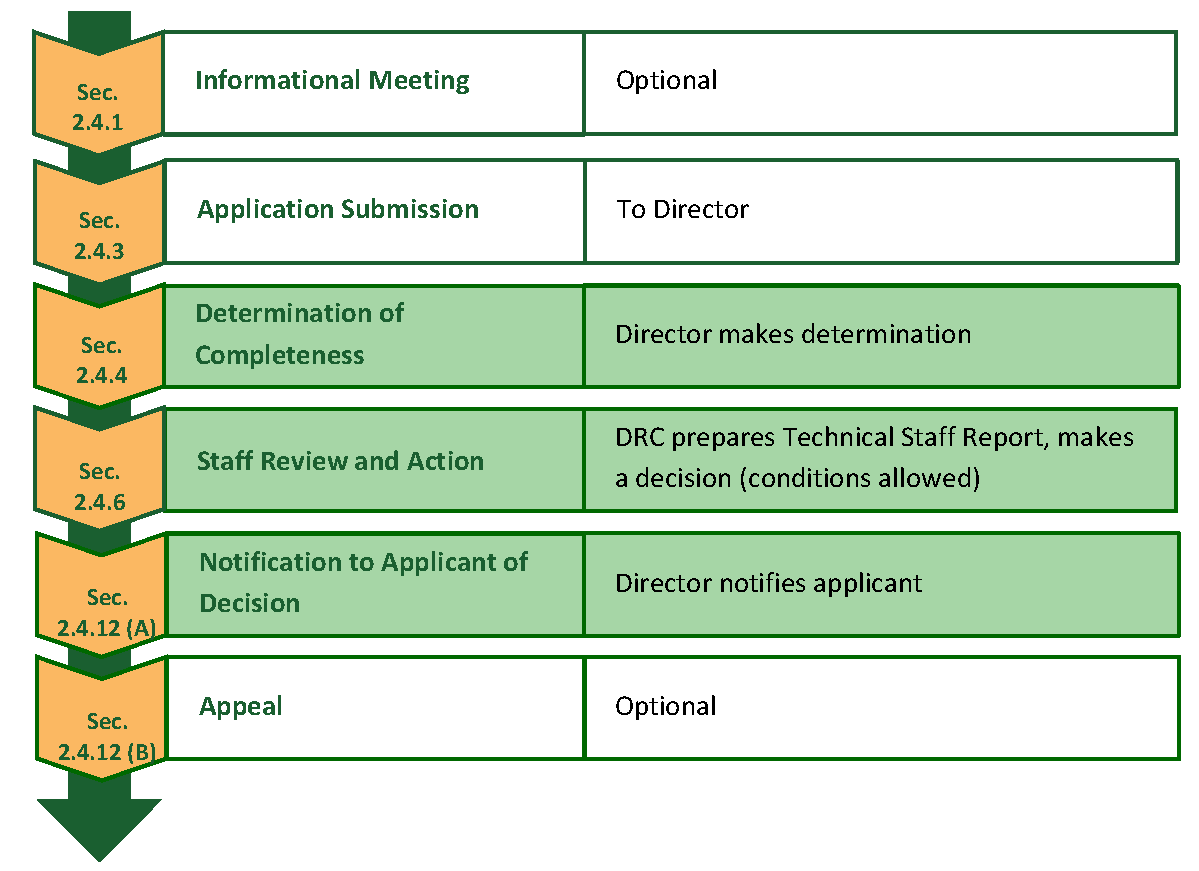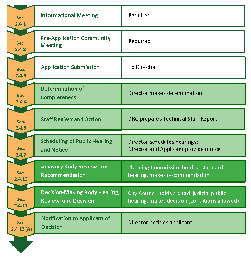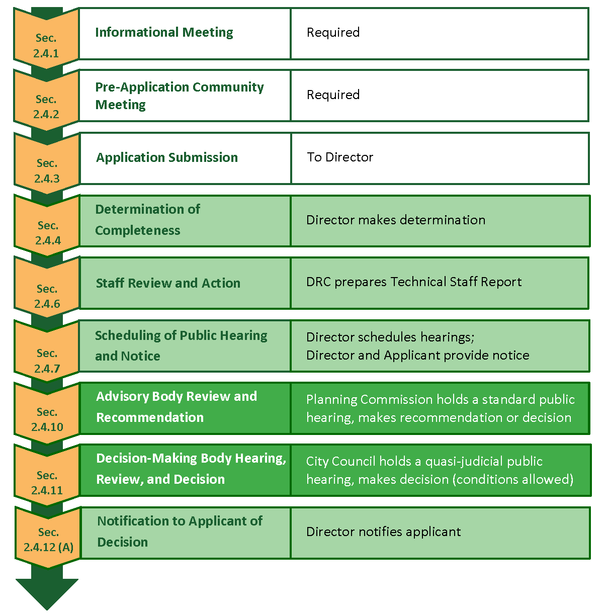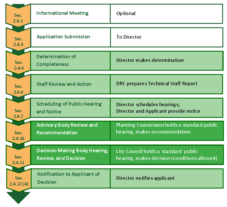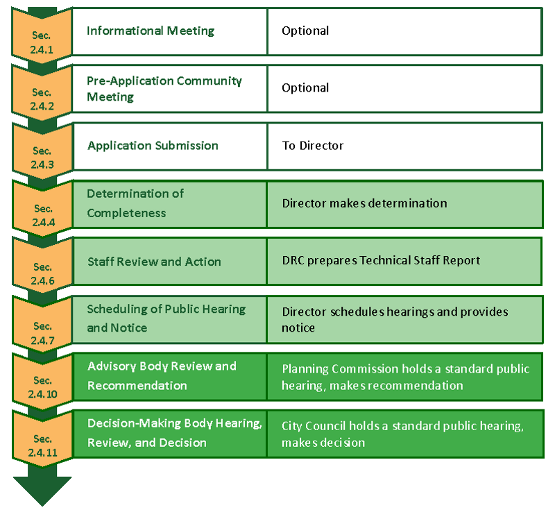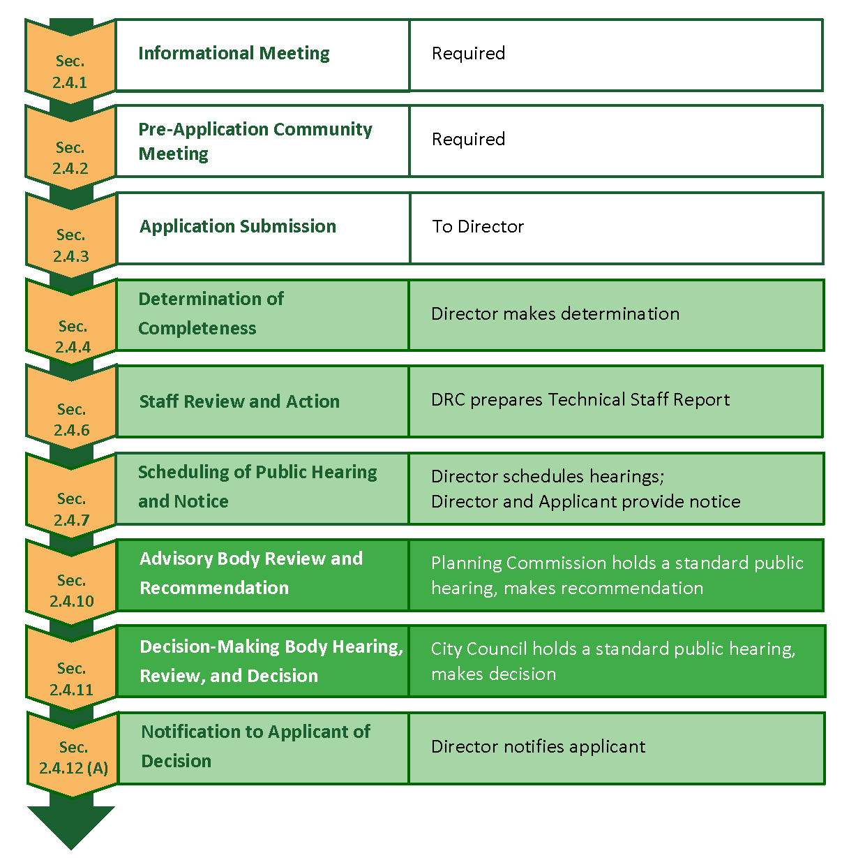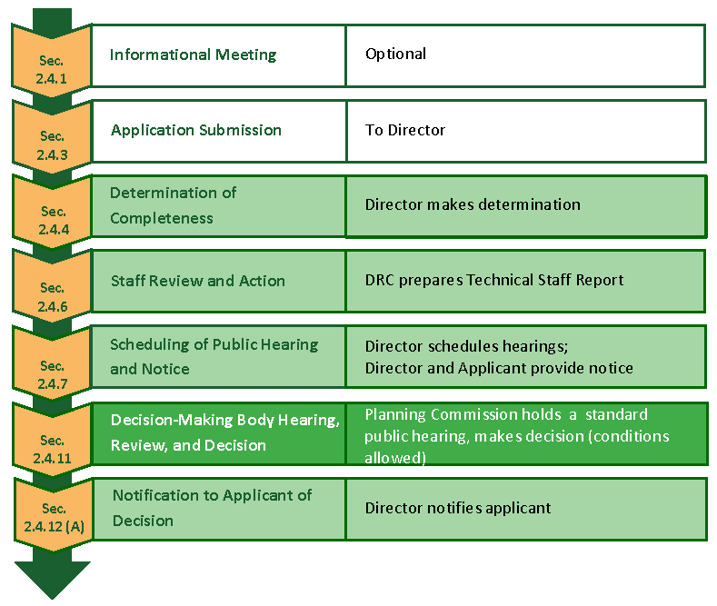 Sec. 2.5, Application-Specific Review Procedures and Decision Standards.Sec. 2.5, Application-Specific Review Procedures and Decision Standards, contains specific information for each type of development application, including applicable additions or modifications to the standard review procedures, and standards for making a decision on the application.