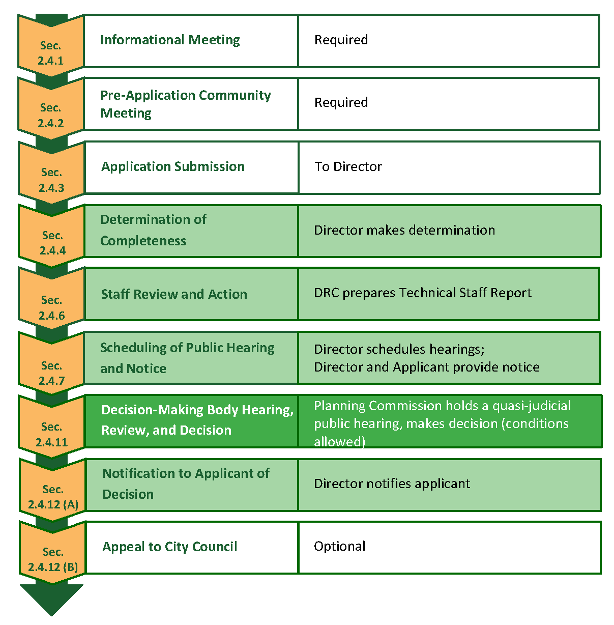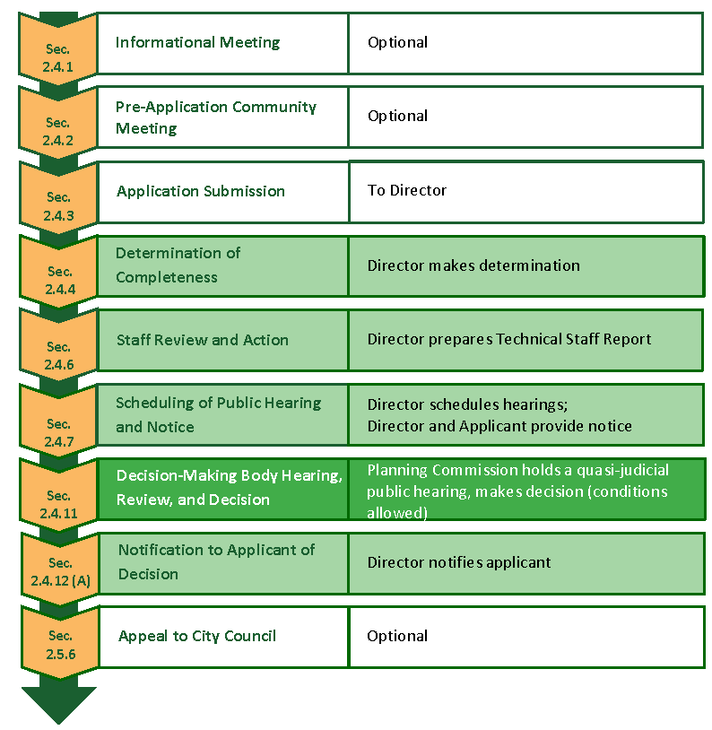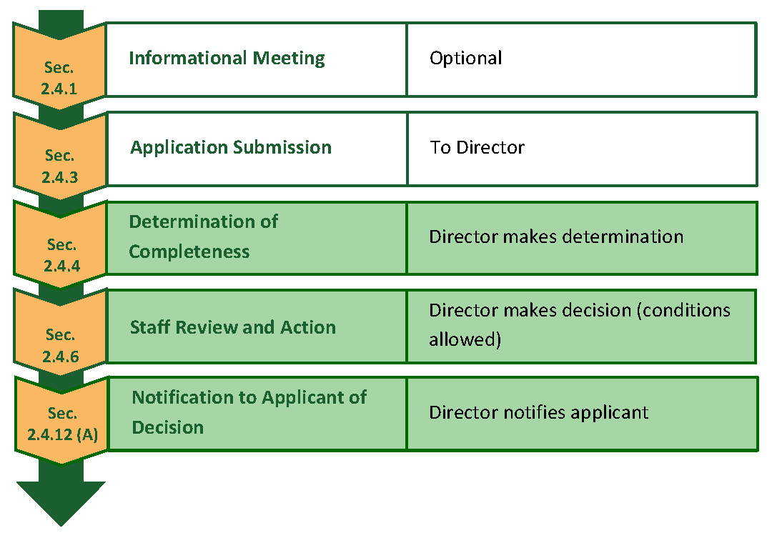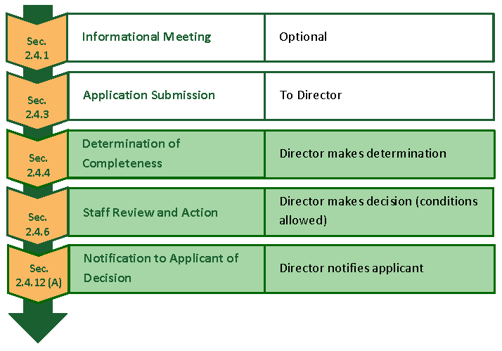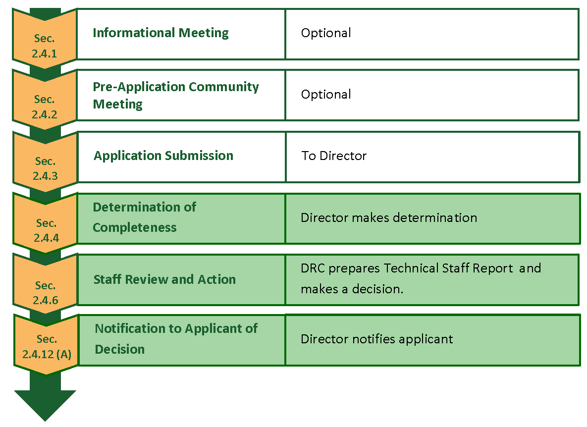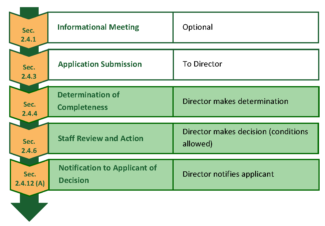 Sec. 2.5, Application-Specific Review Procedures and Decision Standards.Sec. 2.5, Application-Specific Review Procedures and Decision Standards, contains specific information for each type of development application, including applicable additions or modifications to the standard review procedures, and standards for making a decision on the application.