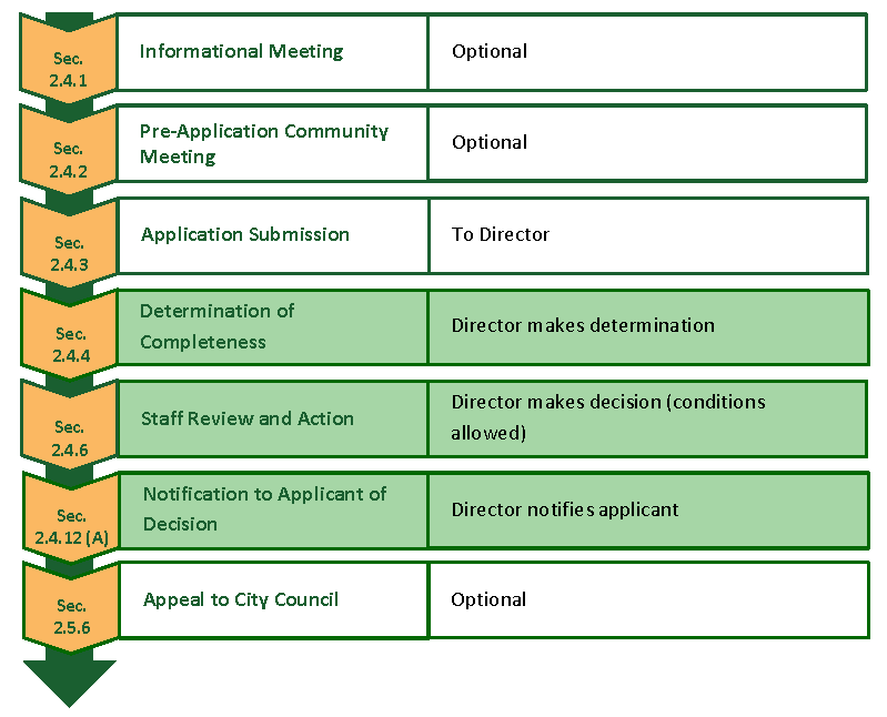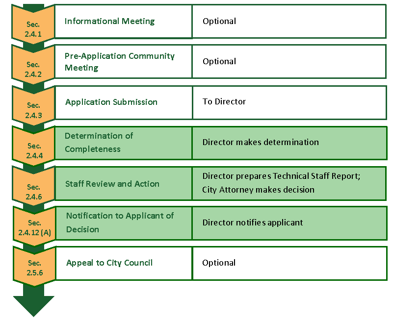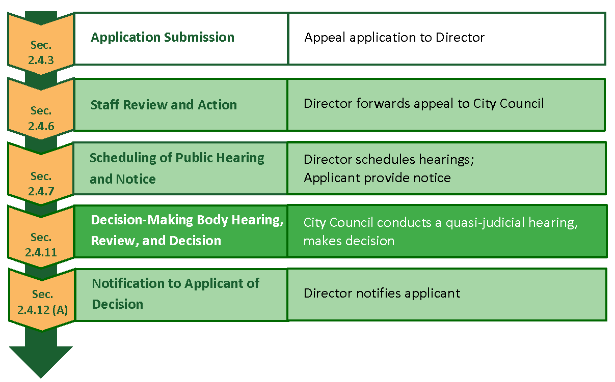 Appeals Procedure. This subsection identifies additions or modifications to the standard review procedures in Sec. 2.4, Standard Review Procedures, that apply to an appeal to City Council. Figure 2.5.5.D.3 identifies key steps in the appeal procedure.