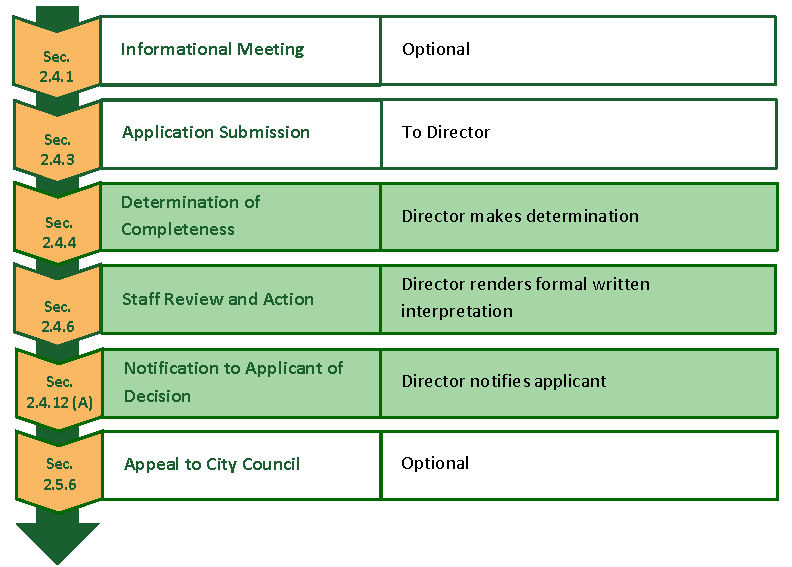 Interpretation Procedure. This subsection identifies additions or modifications to the standard review procedures in Sec. 2.4, Standard Review Procedures, that apply to interpretations. Figure 2.5.6.C identifies key steps in the interpretation procedure.