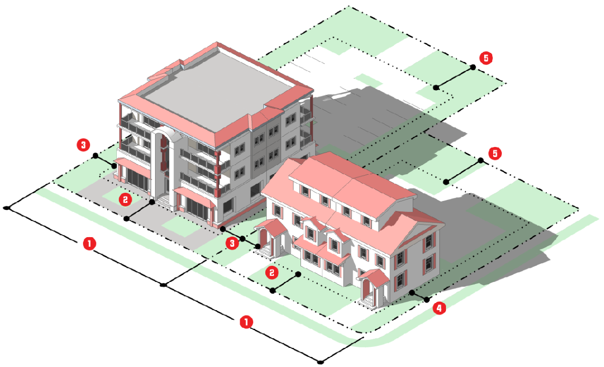 For each base zoning district, the regulations set out the district's purpose, the density and intensity and other dimensional standards applicable in the district, form standards (where relevant), and reference other LDC standards generally applicable to development in the district. Each base zoning district also includes photographs depicting a building form typical in the district and an illustration depicting how the district's dimensional standards apply to lots and typical building forms. Graphics are included for illustrative purposes and show the application of the dimensional, density, and intensity standards to some of the uses allowed in the district. If there is a conflict between the illustrations and the text or tables, the text and tables control.