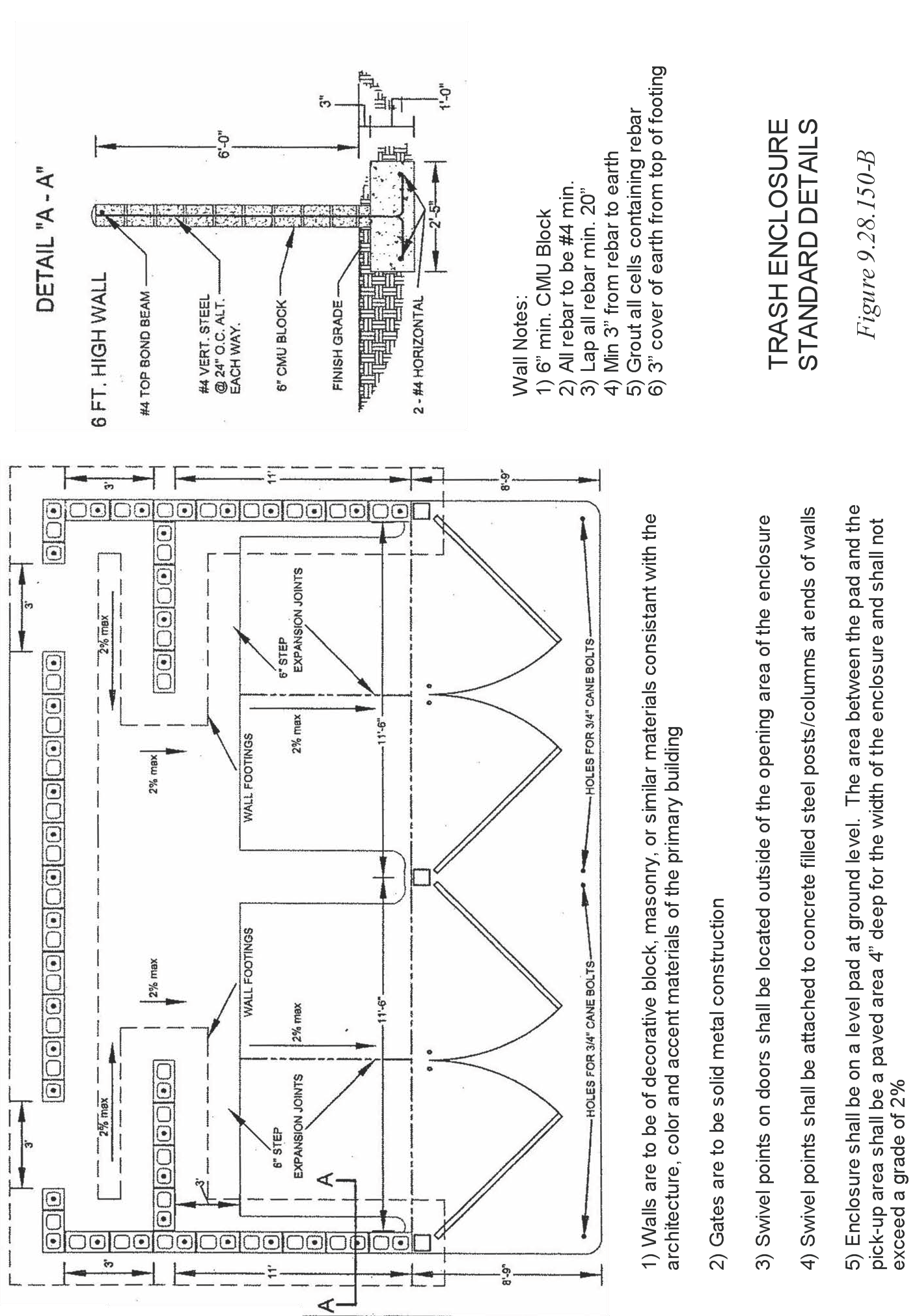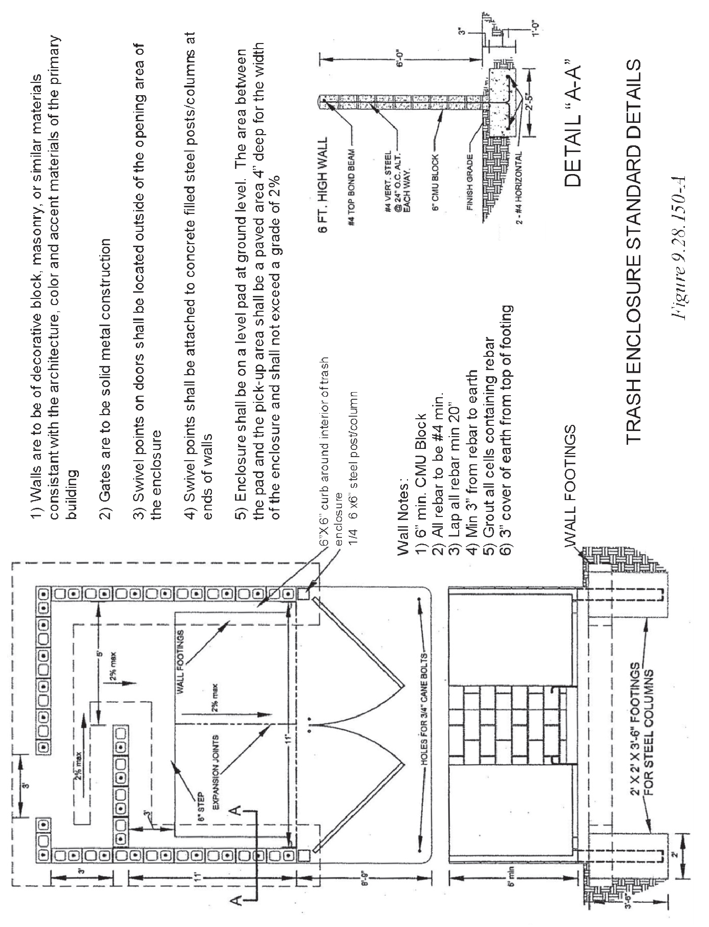 Trash enclosure construction shall be consistent with Figures 9.28.150.A and B. The decorative block or stucco used shall be finished to be compatible with surrounding architectural features.